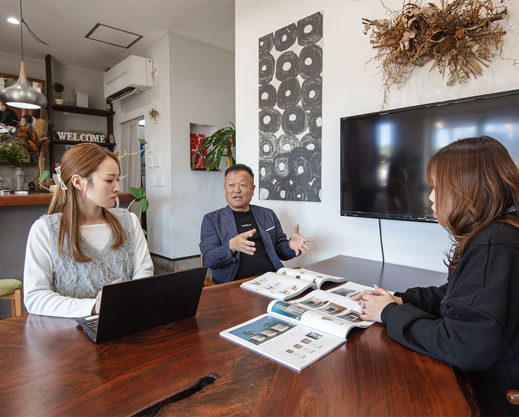休みは取りやすいかな。向井さんの言ったように、どうしてもお客様のご予定に合わせることが多いので休日にしていても出勤になることもあるけれど、その分は振替で休日を取りますね。土日は特に打合せが増えるので普段はあまり休めませんが、事前に用事があって土日の休みを希望していればそんなこともないし、充分休めるかな。残業はしないように心掛けているけれど、事務作業があると少し時間がかかることはありますね。割と自由に動ける身とはいえ、自身の打合せ部門や経理仕事が重なるとあたふたするし、時間の工夫はしています。