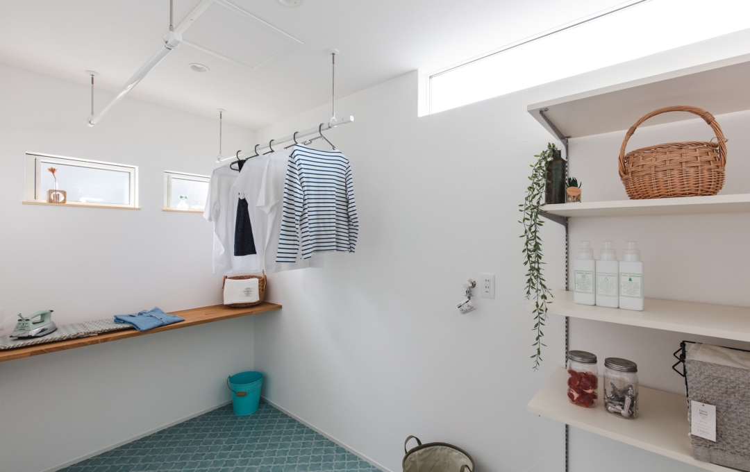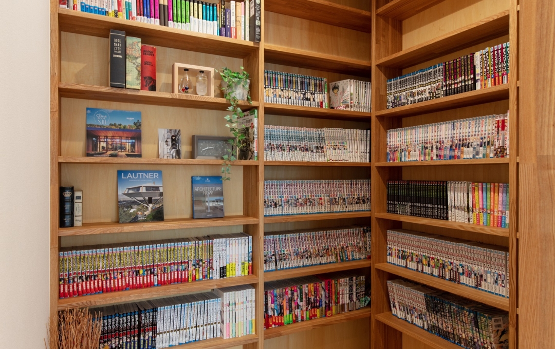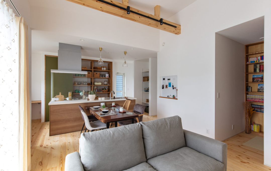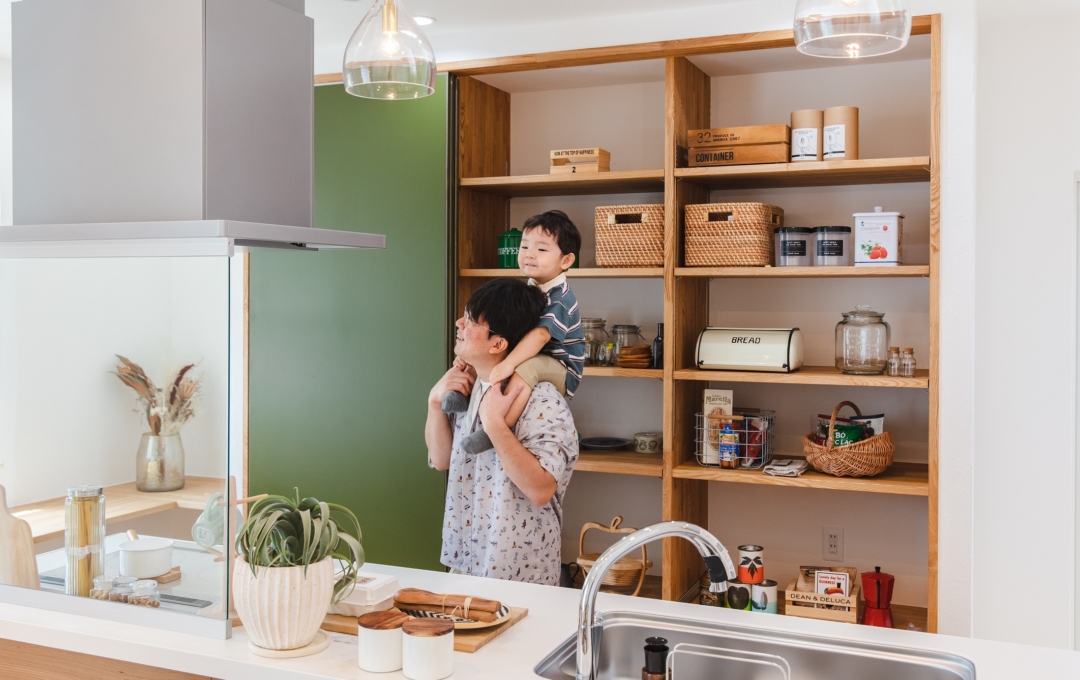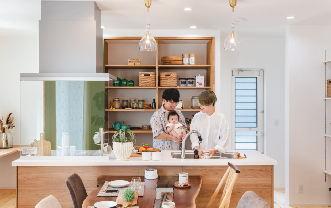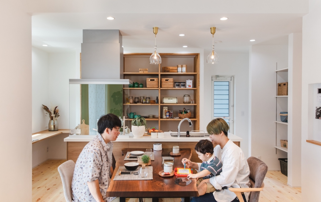 出逢ったのは資料請求のお問い合わせ。 事務所に来て、STUDY!を受けて下さり、ご主人様はいろいろまだ他社も見て検討したらいいんでは?と思っていたそうですが奥様が記す家を気に入ってお問い合わせいただいたので最後まで一途にお付き合いくださいました。すごく嬉しかったですね。 プランの計画最終段階に三人目のお子様を授かり、急遽一部屋増やすことに。 建築が始まっても道から見えているのであそこに建っているのは記す家ですか?といろんな方から連絡いただけるほど。 漆喰をふんだんに使ったリビングや物干し兼脱衣室。 やはり、空気が違います。 みんなが憧れるアイランドキッチンも人気NO.2の扉色。 カップボードは大工さんの造作で扉面材の色は最後まで悩みましたがとてもカワイイ緑色に。 ペンダントライトもお施主様の持ち込み品。 なんと!!!リビングの真ん中にはご夫婦のご趣味であるマンガや子供の絵本を収納する図書室があります。 一畳分の薄畳を敷き、そこで座ってゆっくり読んだり。 今まではアパートでマンガや仕事の参考書の収納場所がなく、段ボールに入っていたり・・・ 大量の本の収納がここにできるようになったので本来リビングにあるはずの収納は洗面脱衣室の横に配置。 洗濯したものをそのままハンガーごと収納へかけれる動線になっています。 共働きで毎日忙しいご夫婦が子供たちとのんびり過ごせるおうちができました。