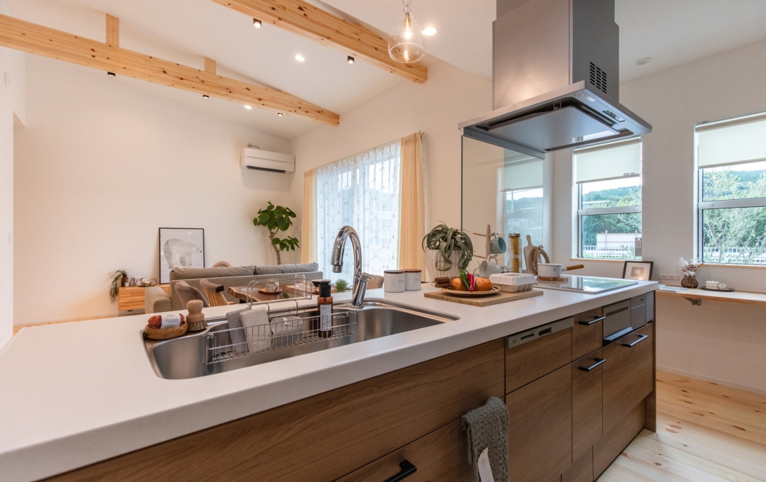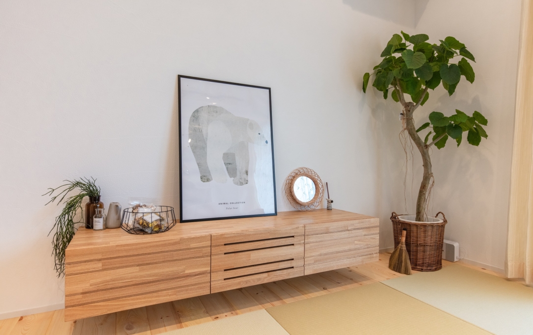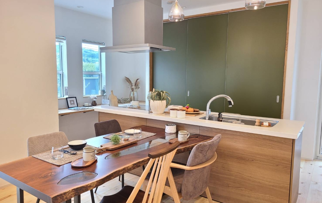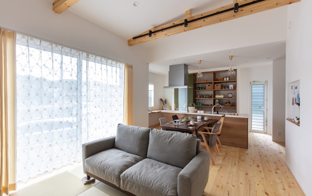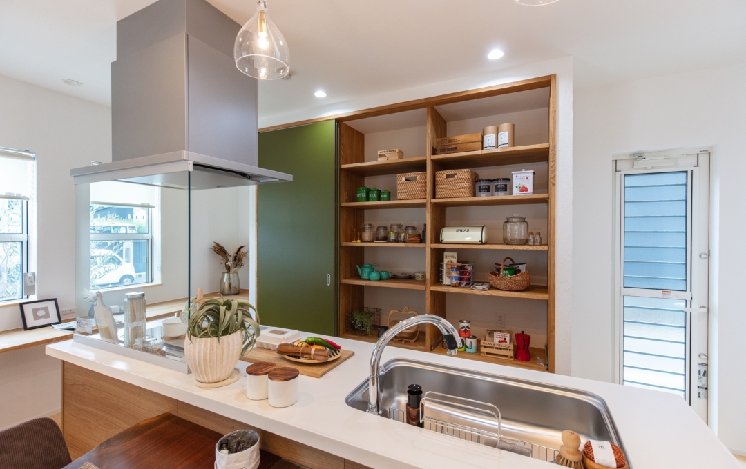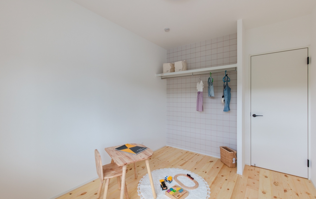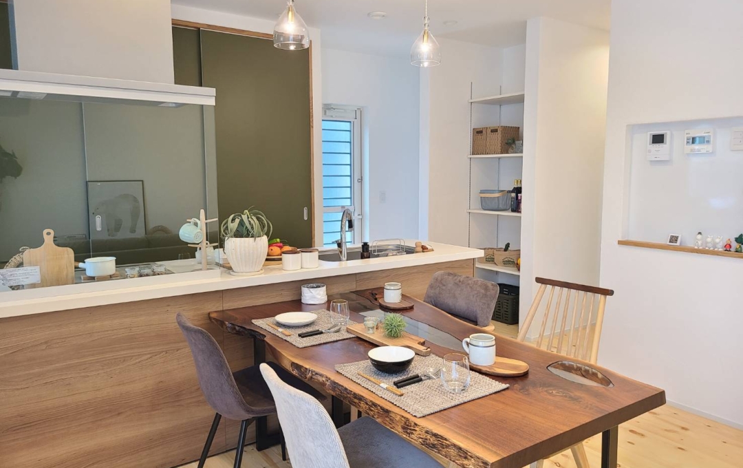 出逢ったのは資料請求のお問い合わせ。 事務所に来て、STUDY!を受けて下さり、ご主人様はいろいろまだ他社も見て検討したらいいんでは?と思っていたそうですが奥様が記す家を気に入ってお問い合わせいただいたので最後まで一途にお付き合いくださいました。すごく嬉しかったですね。 プランの計画最終段階に三人目のお子様を授かり、急遽一部屋増やすことに。 建築が始まっても道から見えているのであそこに建っているのは記す家ですか?といろんな方から連絡いただけるほど。 漆喰をふんだんに使ったリビングや物干し兼脱衣室。 やはり、空気が違います。 みんなが憧れるアイランドキッチンも人気NO.2の扉色。 カップボードは大工さんの造作で扉面材の色は最後まで悩みましたがとてもカワイイ緑色に。 ペンダントライトもお施主様の持ち込み品。 なんと!!!リビングの真ん中にはご夫婦のご趣味であるマンガや子供の絵本を収納する図書室があります。 一畳分の薄畳を敷き、そこで座ってゆっくり読んだり。 今まではアパートでマンガや仕事の参考書の収納場所がなく、段ボールに入っていたり・・・ 大量の本の収納がここにできるようになったので本来リビングにあるはずの収納は洗面脱衣室の横に配置。 洗濯したものをそのままハンガーごと収納へかけれる動線になっています。 共働きで毎日忙しいご夫婦が子供たちとのんびり過ごせるおうちができました。
