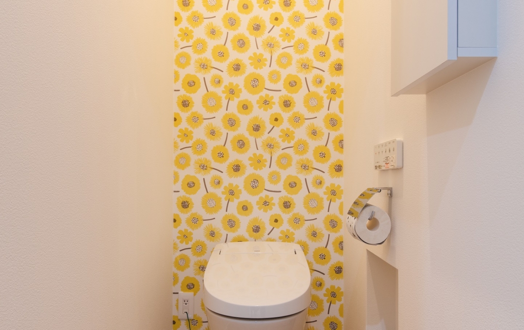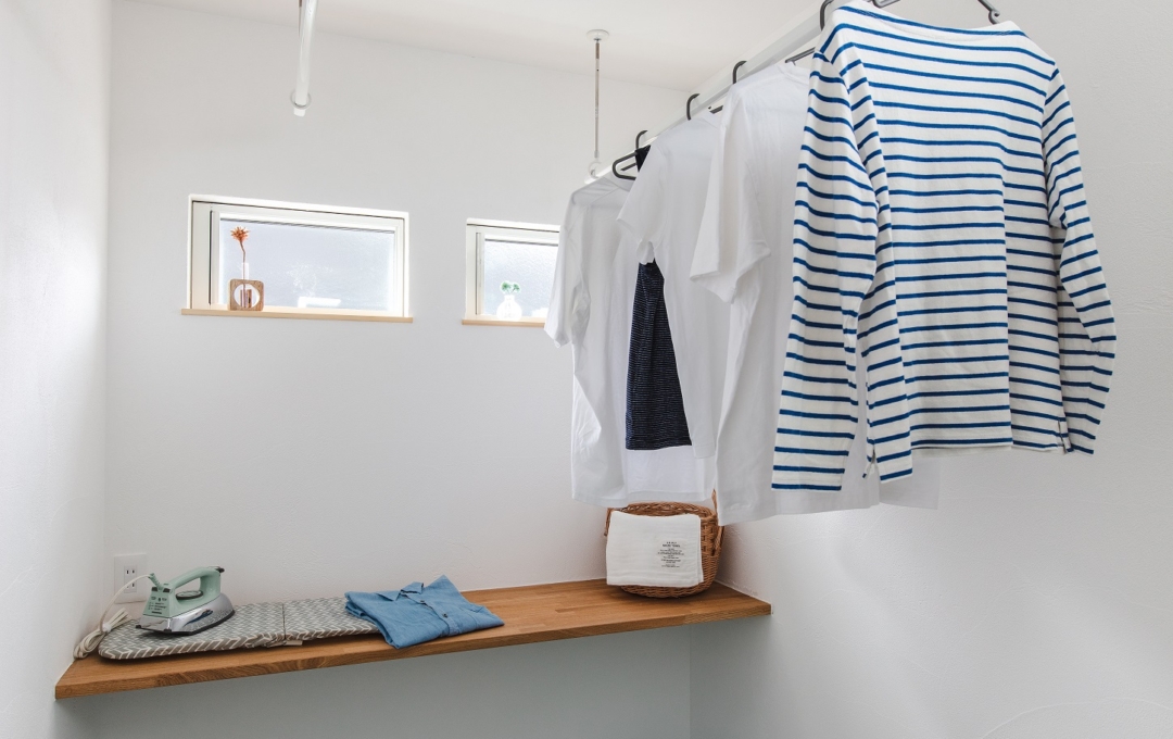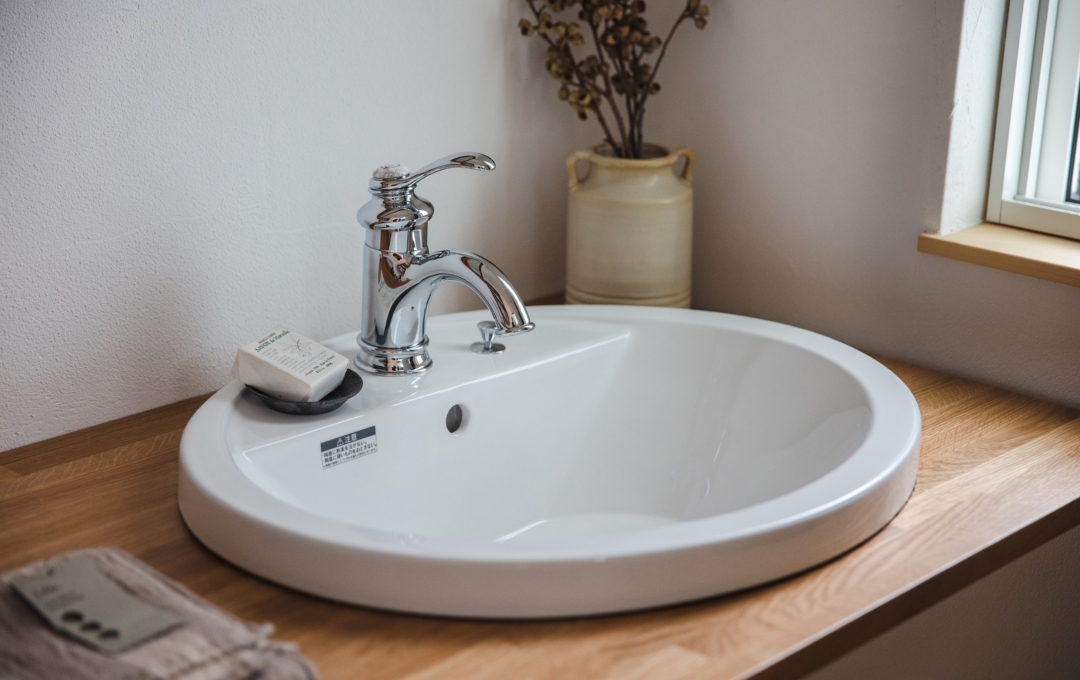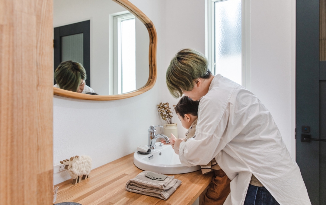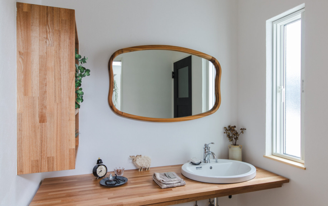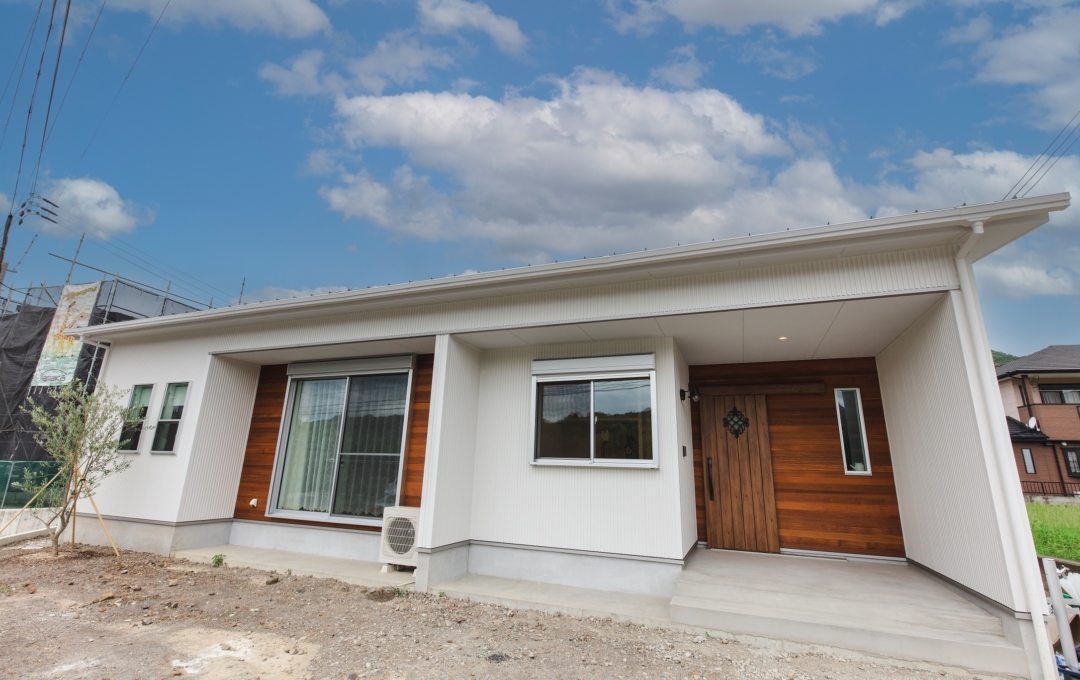 特徴:外観は白いガルバリウム鋼板をメインにレッドシダーをふんだんに使っています。 また、植栽にはオリーブを。中から見ても可愛らしく癒しの空間になるように。内装にはスイス漆喰をふんだんに使い、調湿効果抜群。 脱衣室兼物干し場にも漆喰を施工して毎日の洗濯物を乾き良く。お気に入りは洗面台!もともと造作の洗面台が欲しくて検討していましたが、水の飛び跳ねが気になり・・相談したらメーカーのものでお水に対しての試験を5000回以上したWOODONEのものを勧め、それに決定。 洗面ボウルや水栓もかわいくして、家具店で一目ぼれした鏡と合わせてばっちりコーディネート。 まるで物語に出てきそうなかわいい空間になりました。 toiletも他の壁紙をシンプルにした分思い切って黄色い花柄にしたら可愛くてお気に入りになりました。