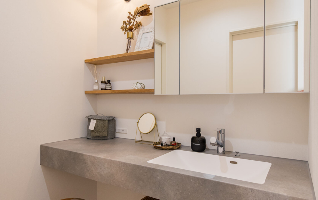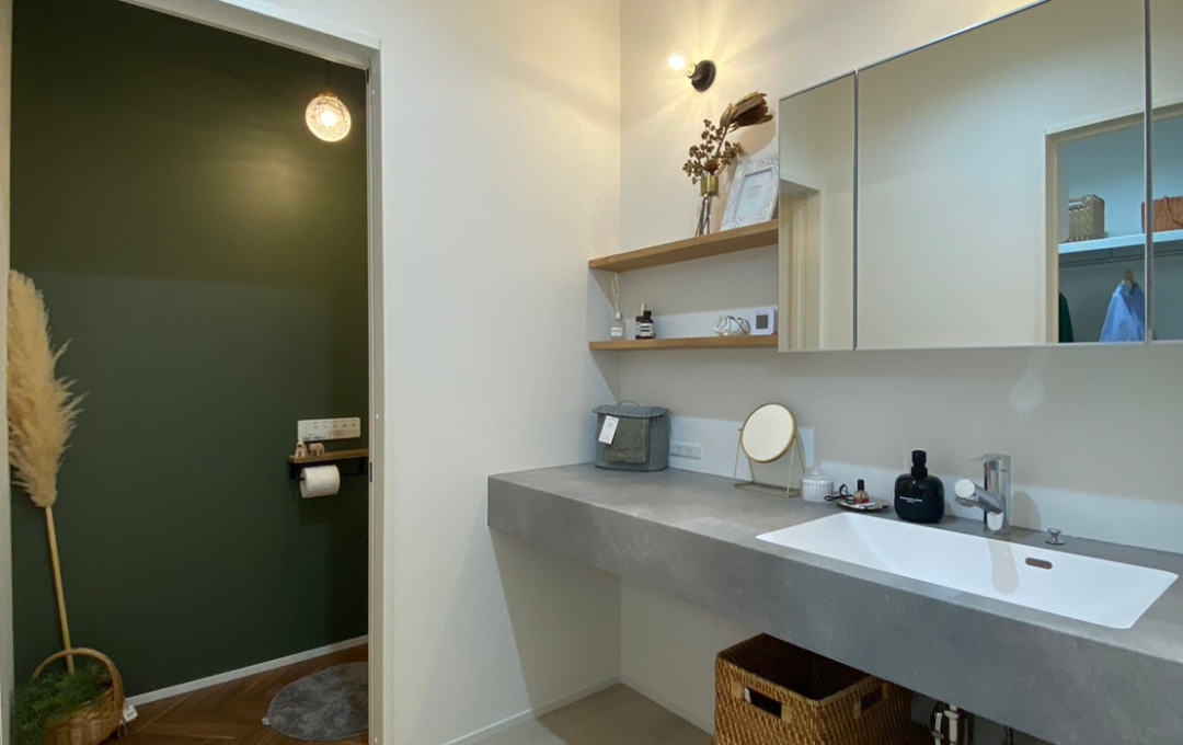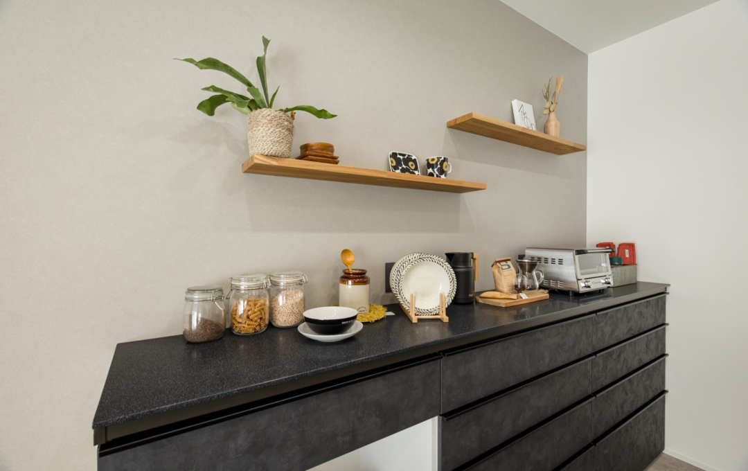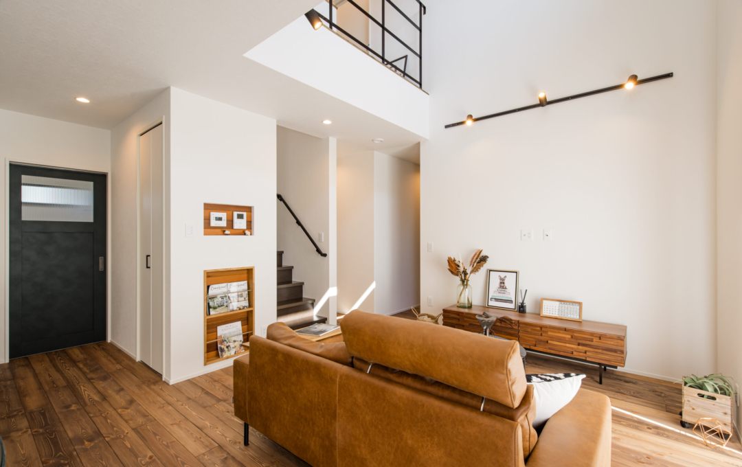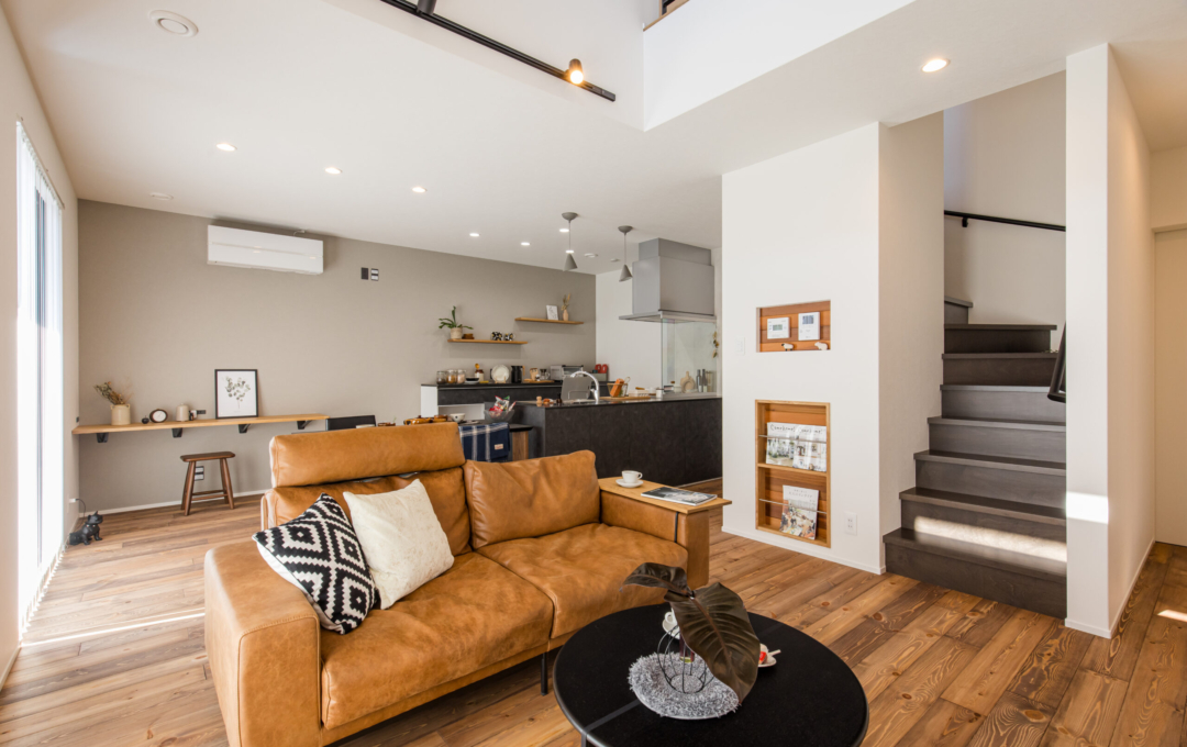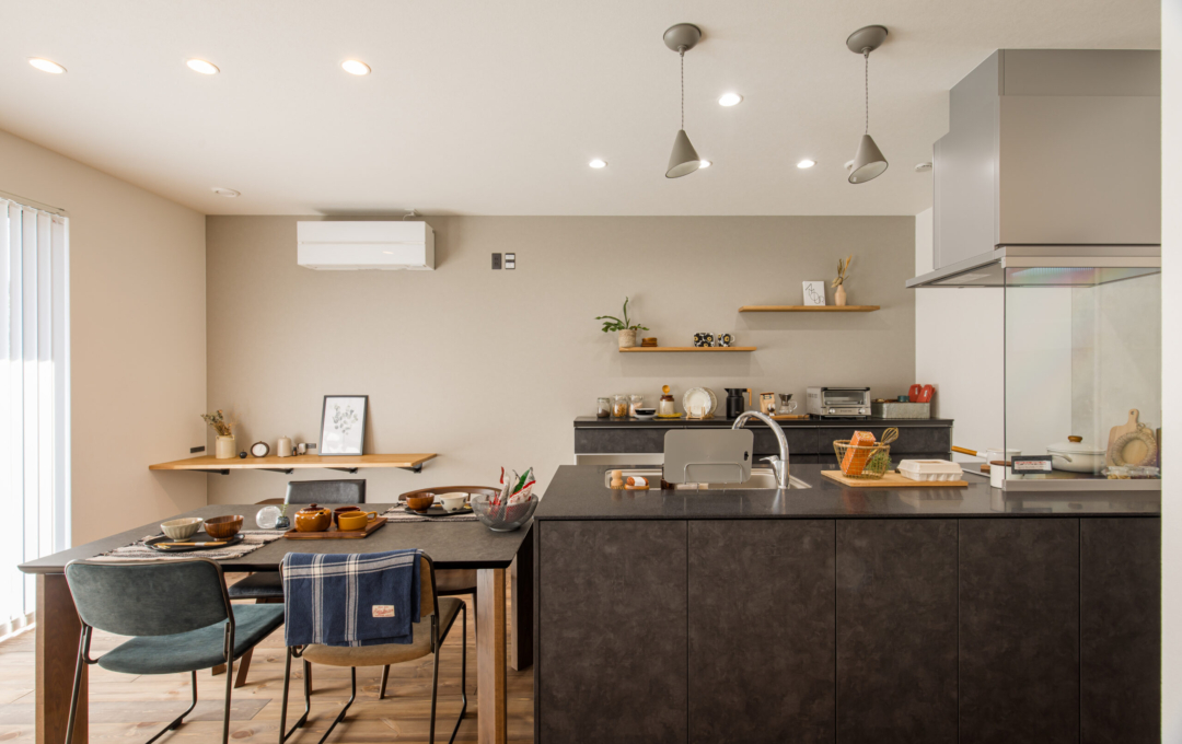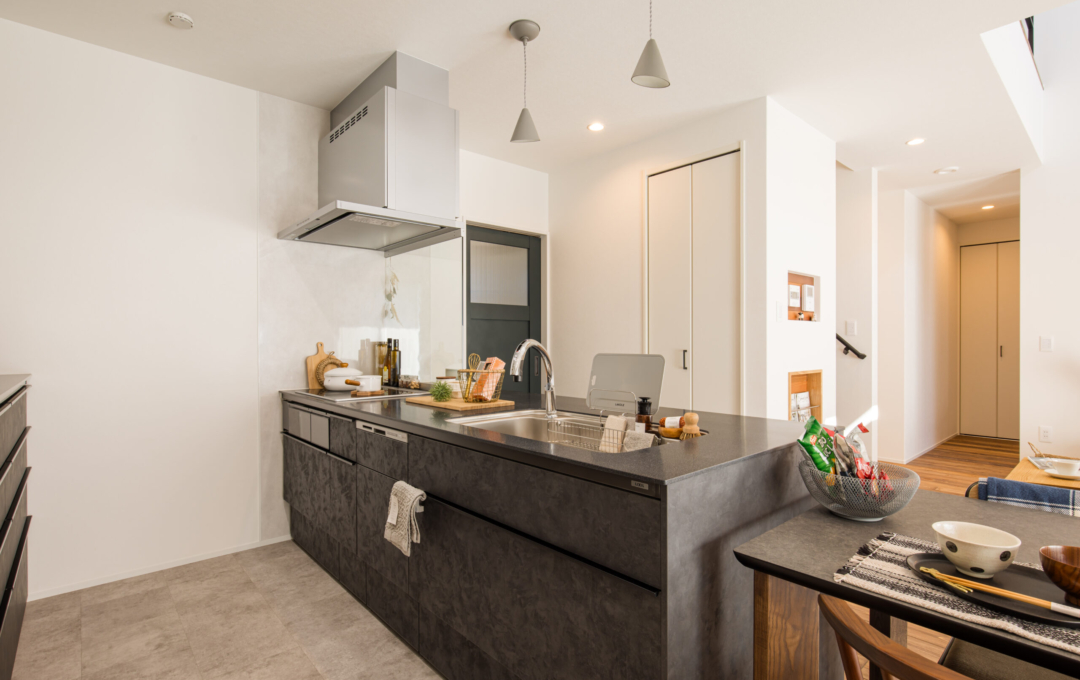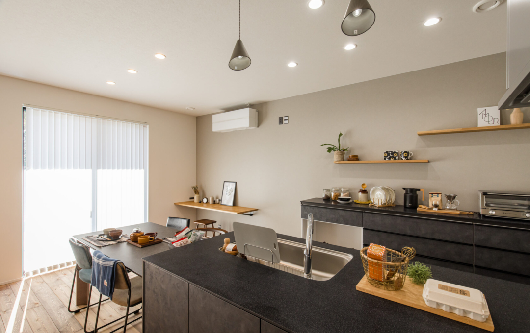 お若いお二人はある業者様のご紹介で完成見学会に来て下さいました。 ジメジメする季節でしたがからっとして涼しい体感をして下さり、その後も勉強して何度か見学会を体感し 決めて下さりました。 お子様ができて新しいおうちで一からの子育ては寒い時期からでした。 毎日温かく、ストレスもなく大変な乳児期も快適に暮らして頂けたとのお声も頂けました。 内装はキッチンとダイニングを横並びにして友達が沢山来てもカウンターにも椅子を置いて座ってもらえるように。 リビング階段で家族のいってきますやただいまがすぐ分かる。 サンルームをご希望で、室内干しが気にせずできるように。 回遊動線なので家事も楽々。 ご主人様の書斎も設け、ゲームやパソコン等プライベートな時間も大切に。 キッチンは天板にブラックストーンを施工。カップボード上も思い切って。