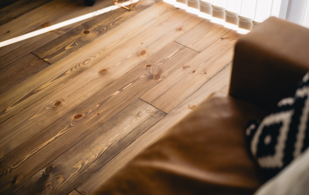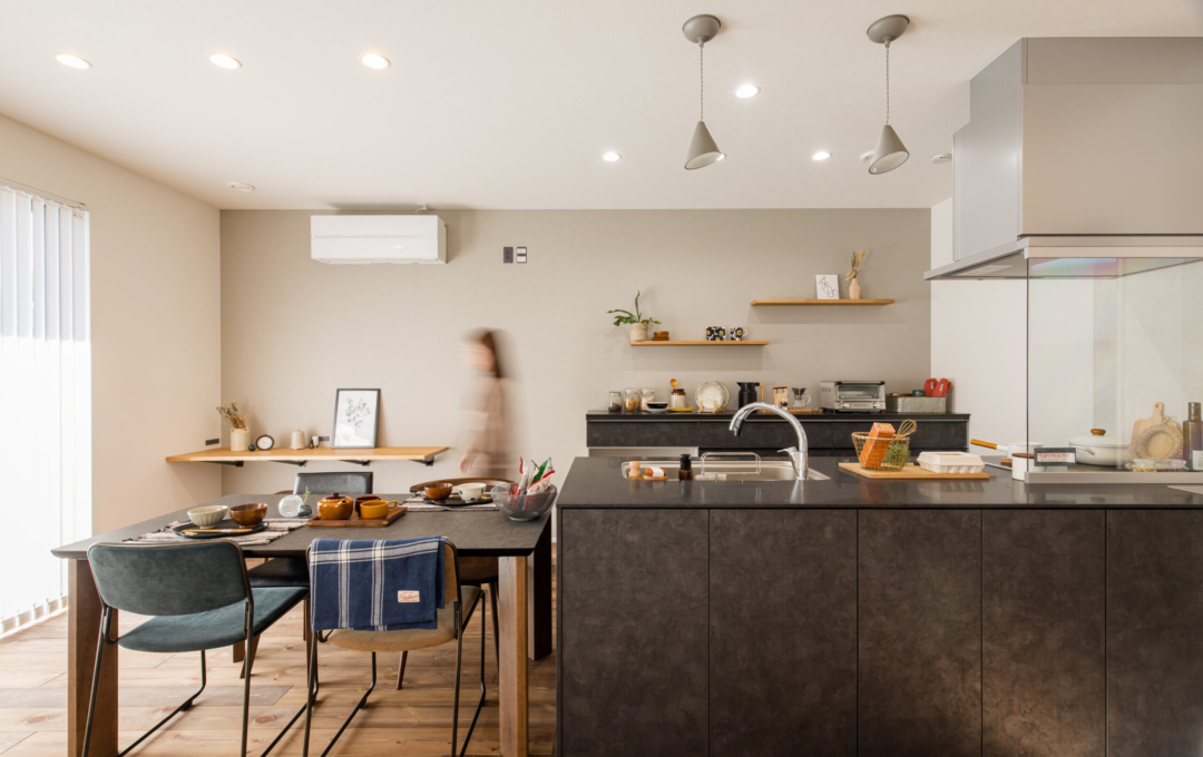 キッチンと横並びのダイニングが家事動線の時短に。 床板はパイン材のウォルナット塗装。 標準で使えるから選ぶのは色味だけ。 やわらかくて踏み心地の良い無垢板は子供は冬でも素足で過ごすほどの温かさ。