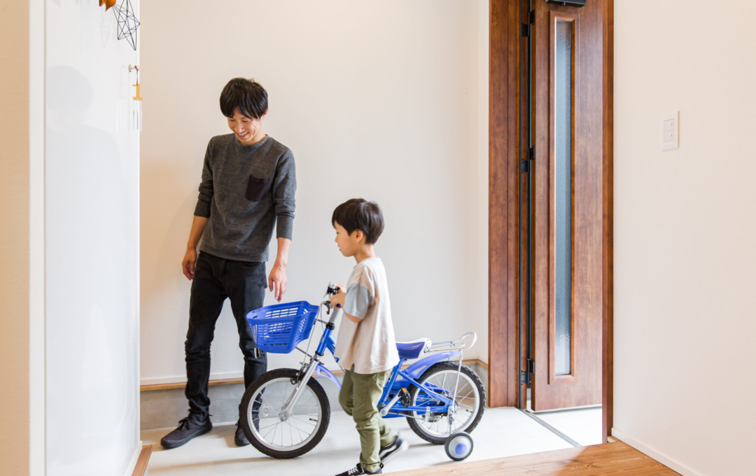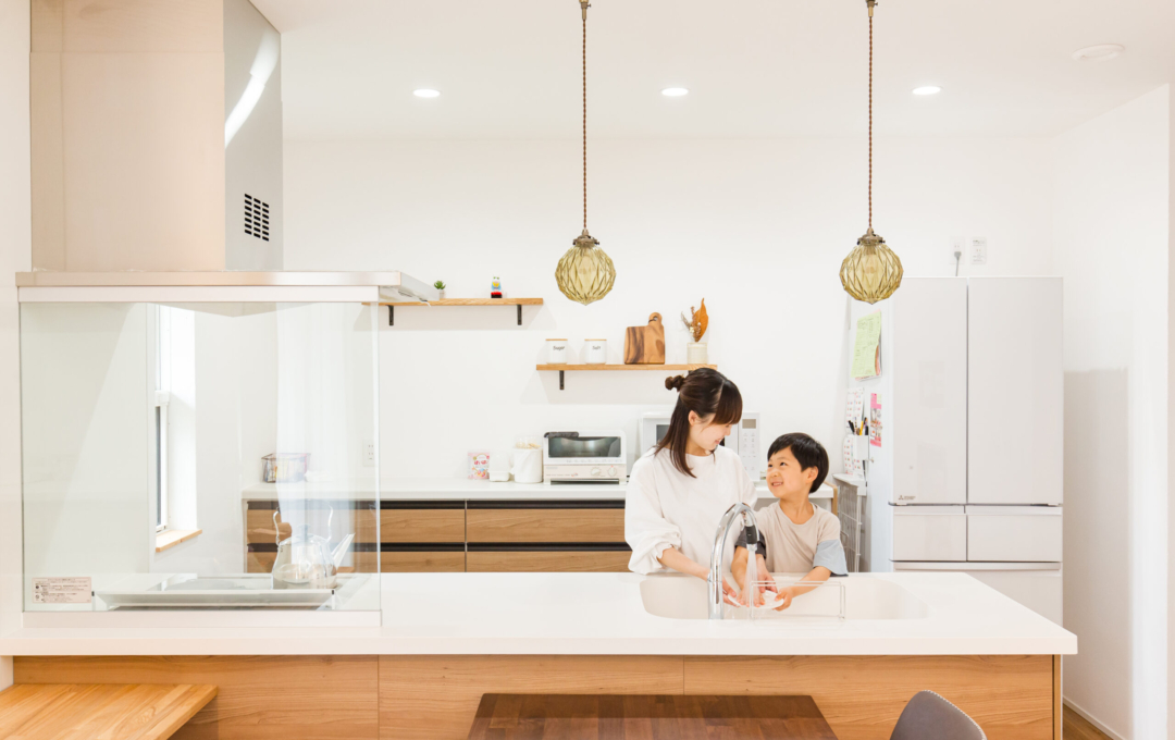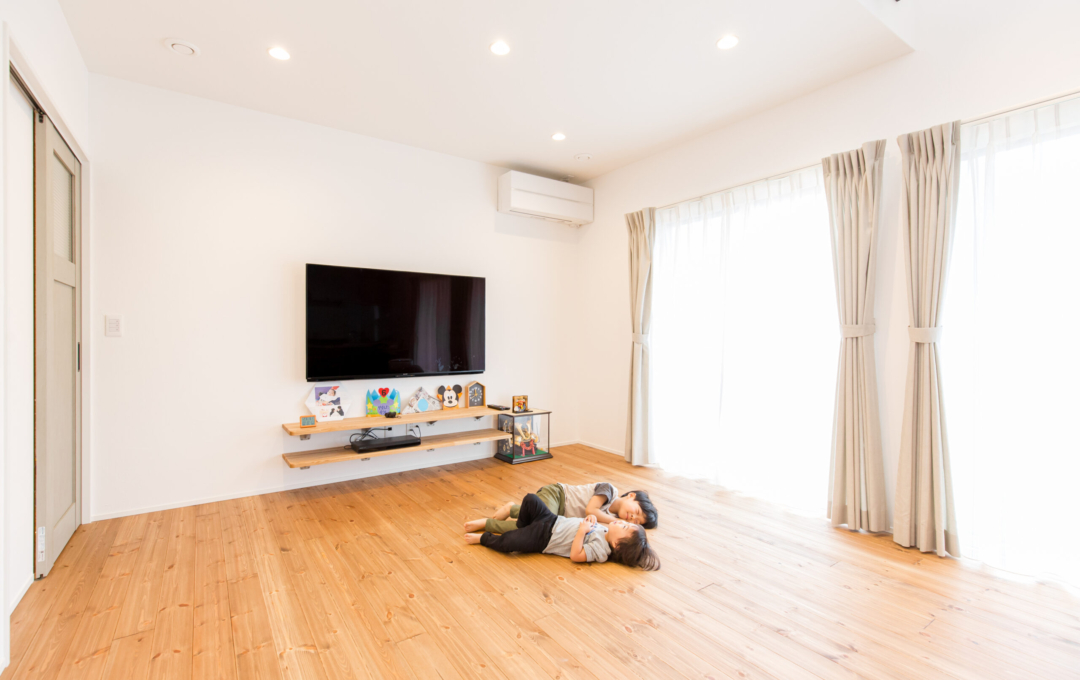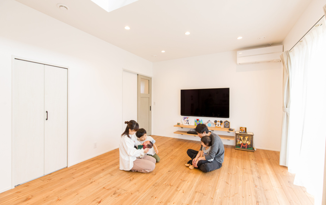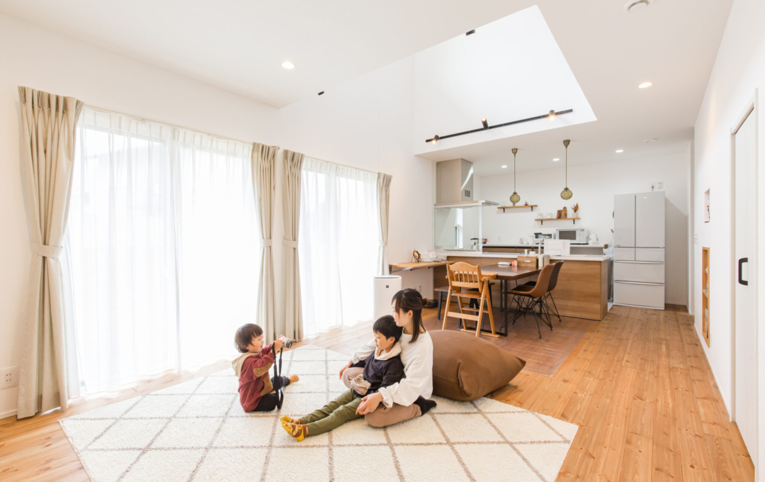土地探しから始まったおうち創り。こだわりの場所があり、そこで何度も探しましたが巡り合えず・・今の土地と出逢ったことでスタート!!土地の造成に時間がかかり、出会ってからは2年くらいかかりましたが無事に素敵なおうちが完成しました。 おうちの計画をして間取りが決まってから3人目の妊娠→出産。 このおうちで一から子育てができるのを楽しみにされていました。 何と言っても動線が最高で、玄関からすぐに洗面に行ける回遊動線が毎日の忙しい子育てには抜群です。 洗濯物もサンルームで沢山干しても漆喰の壁が渇きを速めてくれるので楽ちん。 二階の吹き抜け手摺にもタオルをかけたり・・・ 収納もたくさんあるのでモノがあふれることもなく、見えないところに置けるので便利ポイント。 共働きのご夫婦には考えられた間取りと動線を提案。 明るく広いリビングでは子供たちが走り回れます。 学校帰りの子供たちもこのおうちを見て 「わ~カッコいい。こんな家に住みたいな。」と言っているのを社長とコーディネーターがたまたま聞きました。