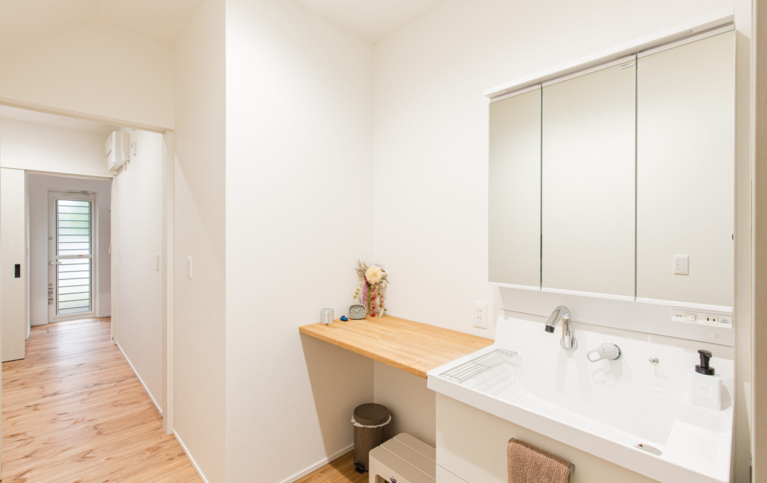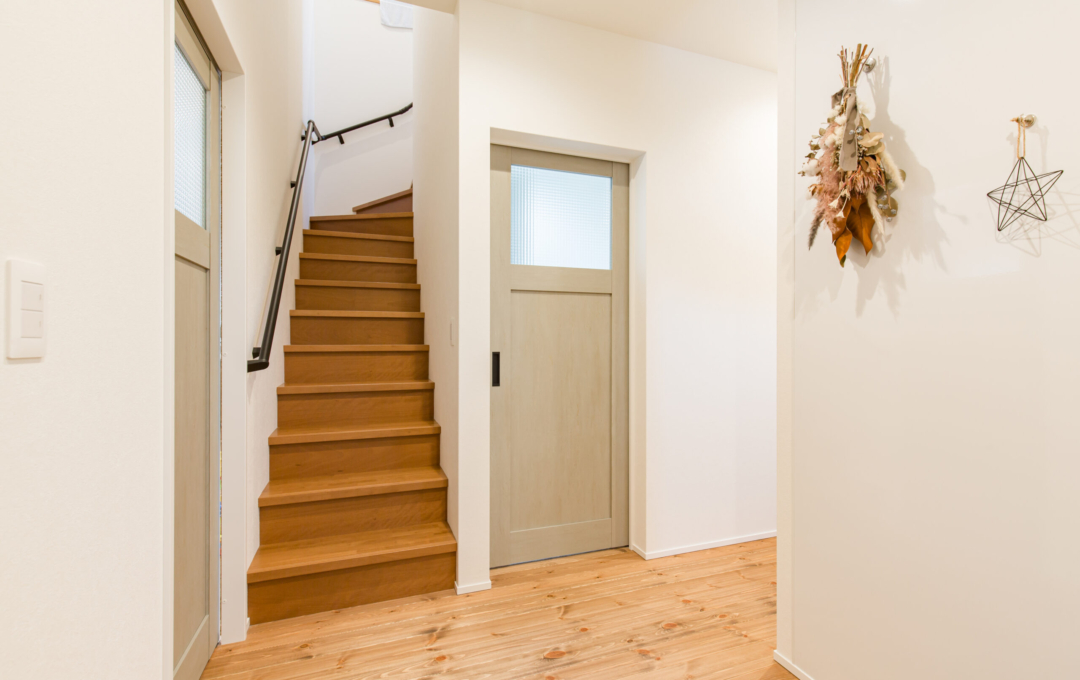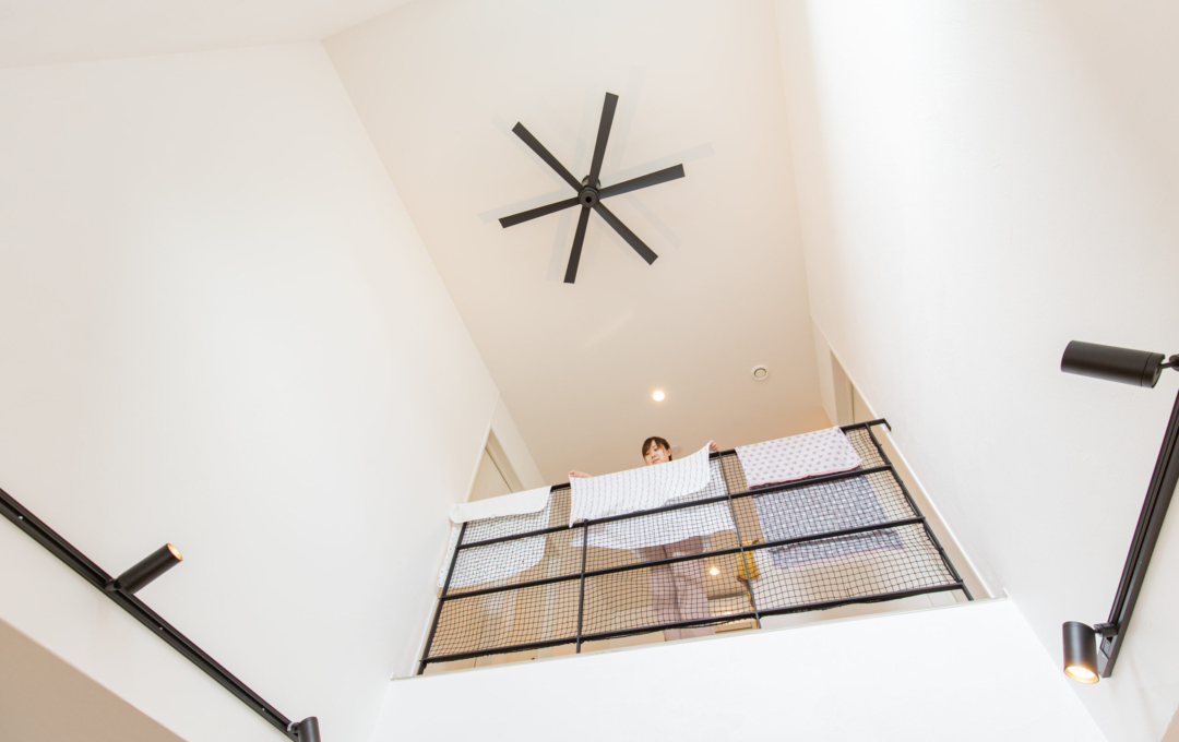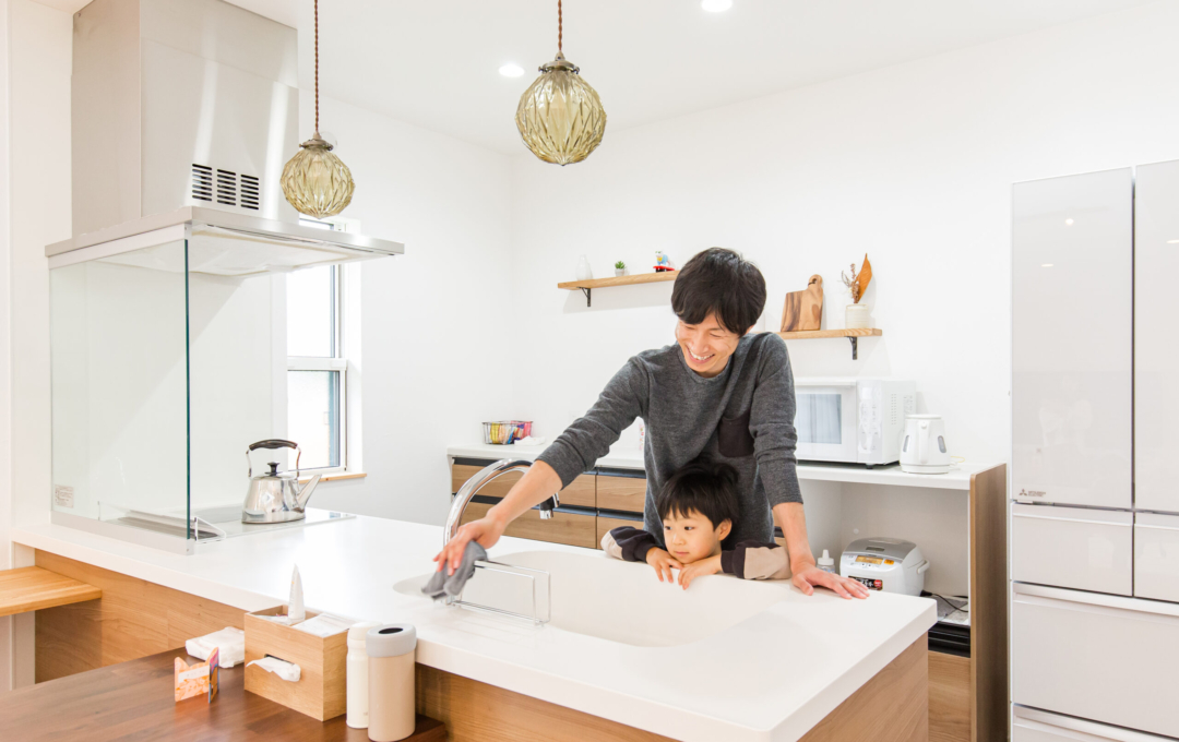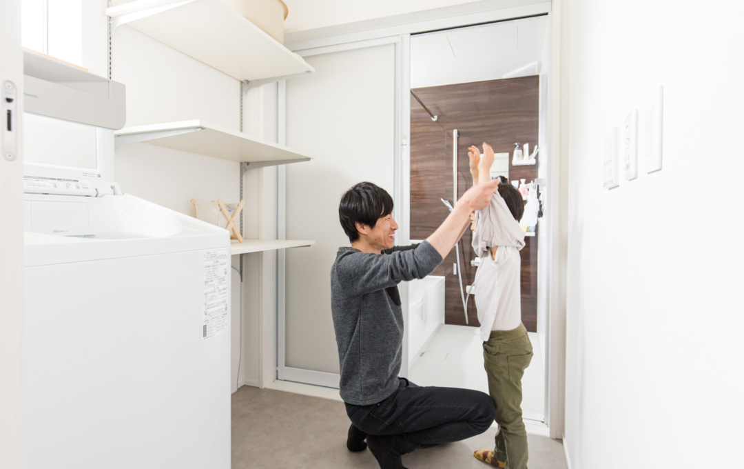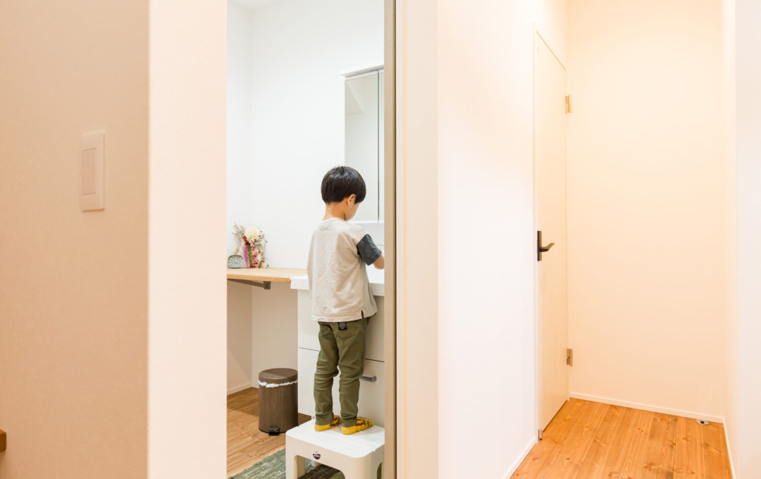 土地探しから始まったおうち創り。こだわりの場所があり、そこで何度も探しましたが巡り合えず・・今の土地と出逢ったことでスタート!!土地の造成に時間がかかり、出会ってからは2年くらいかかりましたが無事に素敵なおうちが完成しました。 おうちの計画をして間取りが決まってから3人目の妊娠→出産。 このおうちで一から子育てができるのを楽しみにされていました。 何と言っても動線が最高で、玄関からすぐに洗面に行ける回遊動線が毎日の忙しい子育てには抜群です。 洗濯物もサンルームで沢山干しても漆喰の壁が渇きを速めてくれるので楽ちん。 二階の吹き抜け手摺にもタオルをかけたり・・・ 収納もたくさんあるのでモノがあふれることもなく、見えないところに置けるので便利ポイント。 共働きのご夫婦には考えられた間取りと動線を提案。 明るく広いリビングでは子供たちが走り回れます。 学校帰りの子供たちもこのおうちを見て 「わ~カッコいい。こんな家に住みたいな。」と言っているのを社長とコーディネーターがたまたま聞きました。