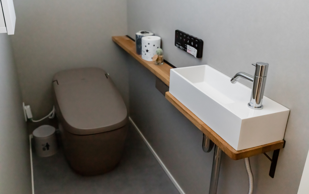 かわいいとカッコいいがちょうどいい具合にちりばめられた自慢のおうち。クロス使いや水周りにはこだわり、自分たちの理想のモノが形になりました。洗面は憧れのアイカのカウンター、キッチンはワンランク上のリシェル、トイレもひとめぼれのサティスGのノーブルトープ。脱衣室にはアイアンの造作物干しを。外観にもこだわり、スイス漆喰にレッドシダー使いが自慢。ひときわ目を引くお庭の人工芝は自分たちで施工しました。