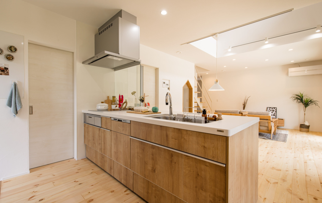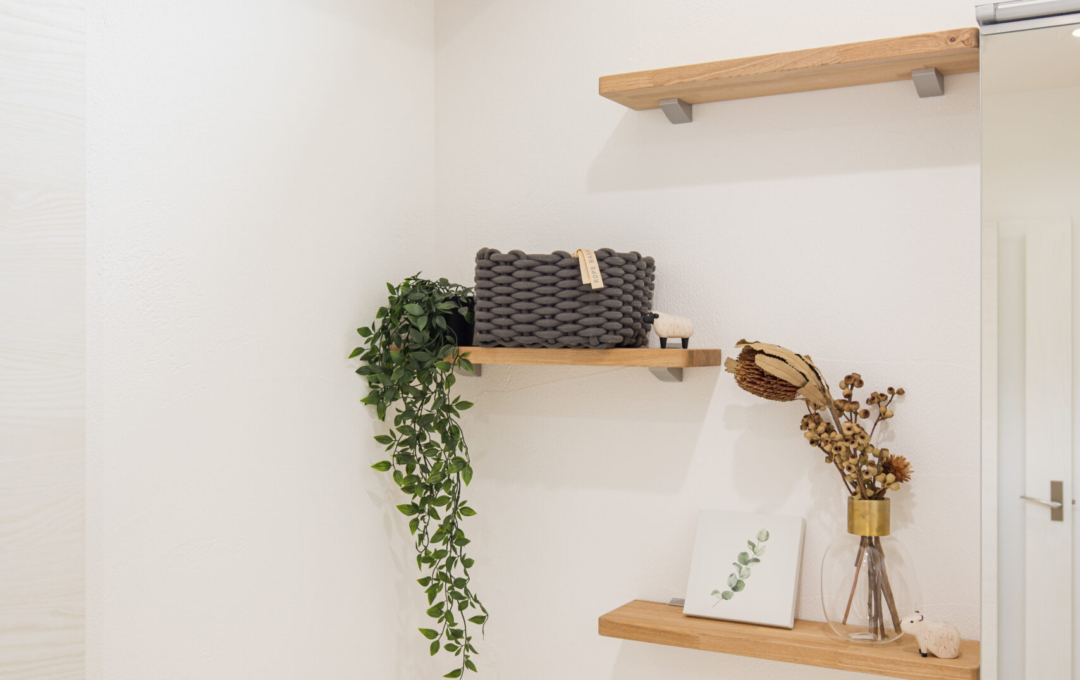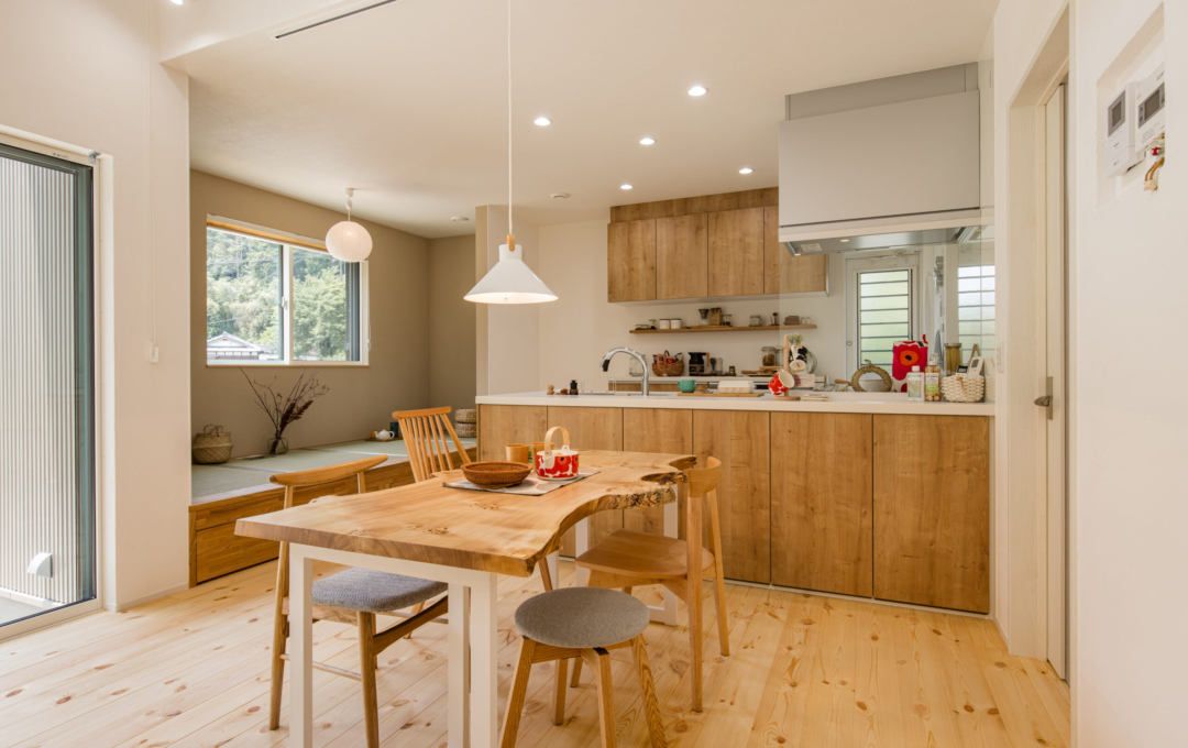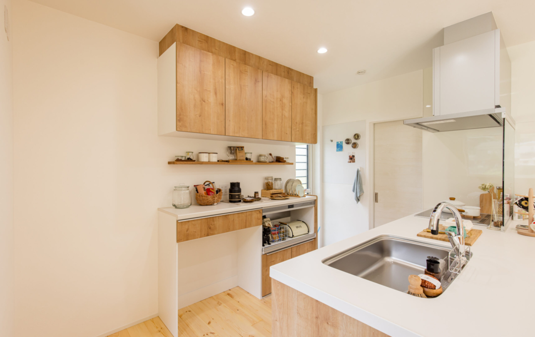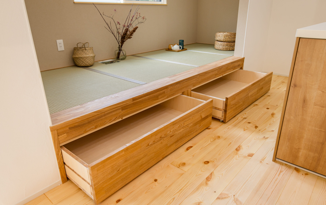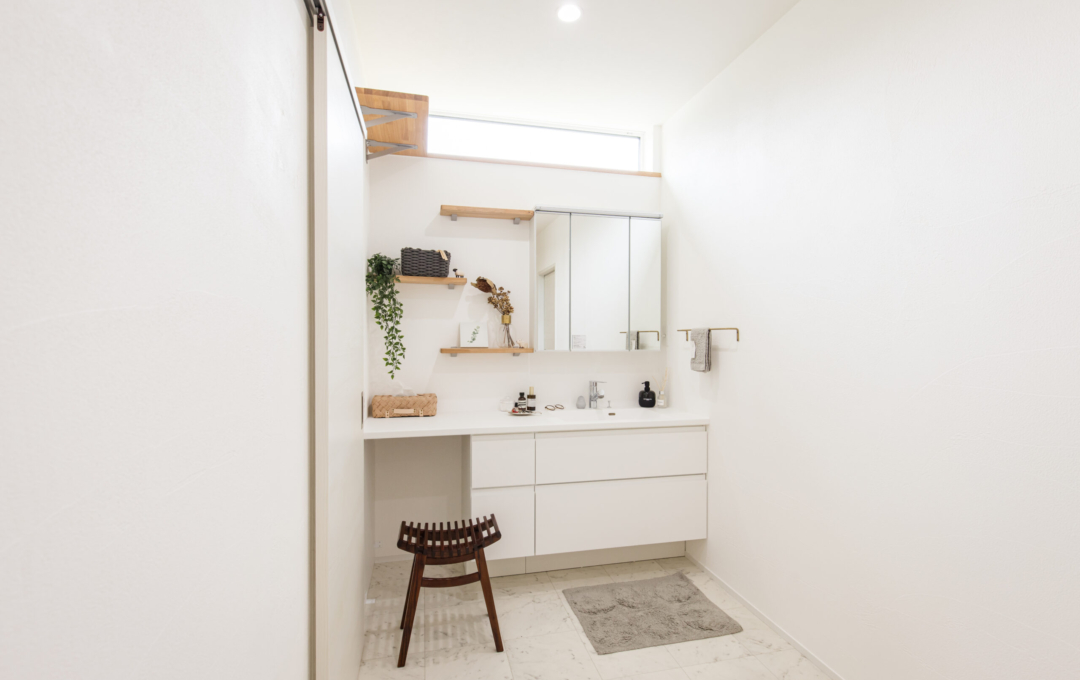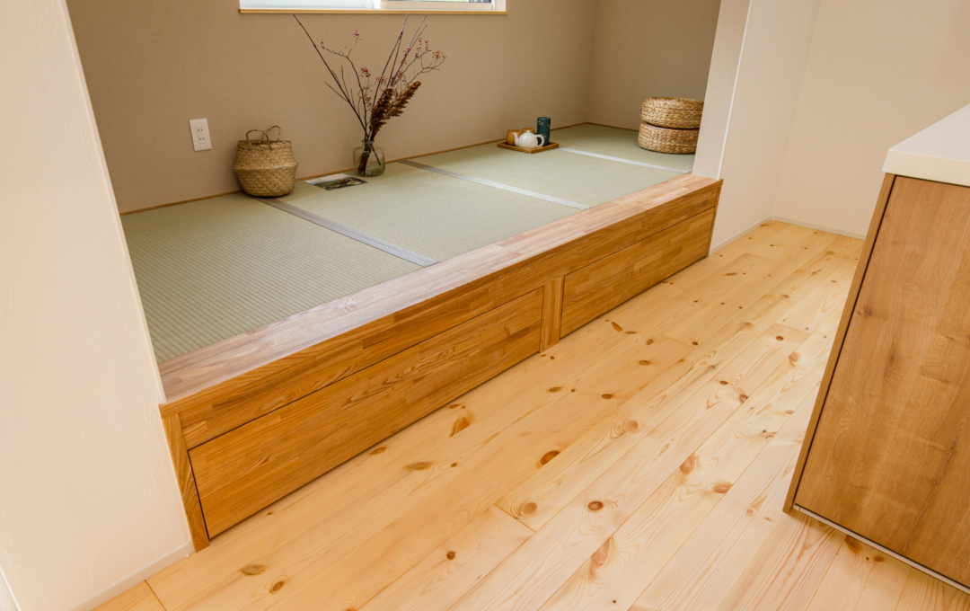 自然素材が気になってお問い合わせ下さった奥様。 ナチュラルな中にも和の雰囲気も取り入れ、無垢の床や漆喰などをふんだんに使い、仕上げました。 畳コーナーを一段上げてそこでお昼寝・本読み・お茶等自由に使えるように。下のスペースは収納で大工さんの造作。 遊び心も取り入れリビングの階段下を使ってお子様の遊ぶ場所兼収納にもなるように工夫しました。 白を基調としているのでとても明るく開放感のあるおうちに。 また洗面にはネコちゃんのキャットウォークになるように段違いに棚を作り最後に窓台で日向ぼっこできる造りにしています。 洗面もランドリールームと兼ね、すぐにファミリークローゼットに移動できるような動線になっています。 二階にもサブの洗面台を設置しました。 玄関は段差を低くし、上りやすいようにしました。 外壁はシャンパンゴールドと本物のレッドシダーの組み合わせ。 これからお庭などもカスタマイズされるのが楽しみですね。