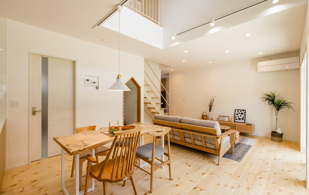 階段はアイアンとの組み合わせで途中まではスケルトン。 照明やシーリングファンもホワイトでまとめています。 広く明るいリビングで子供も大人もネコちゃんもゆっくりくつろげる空間ができました。