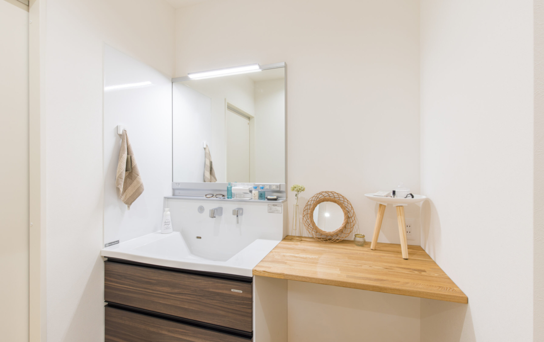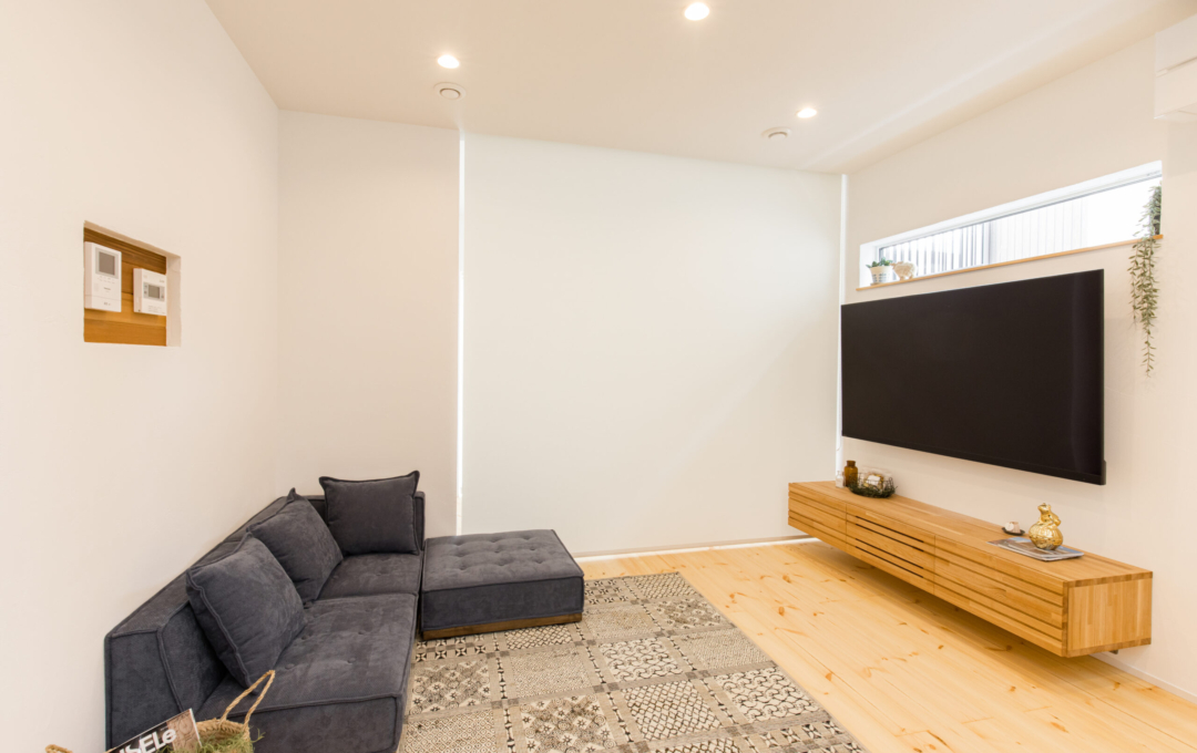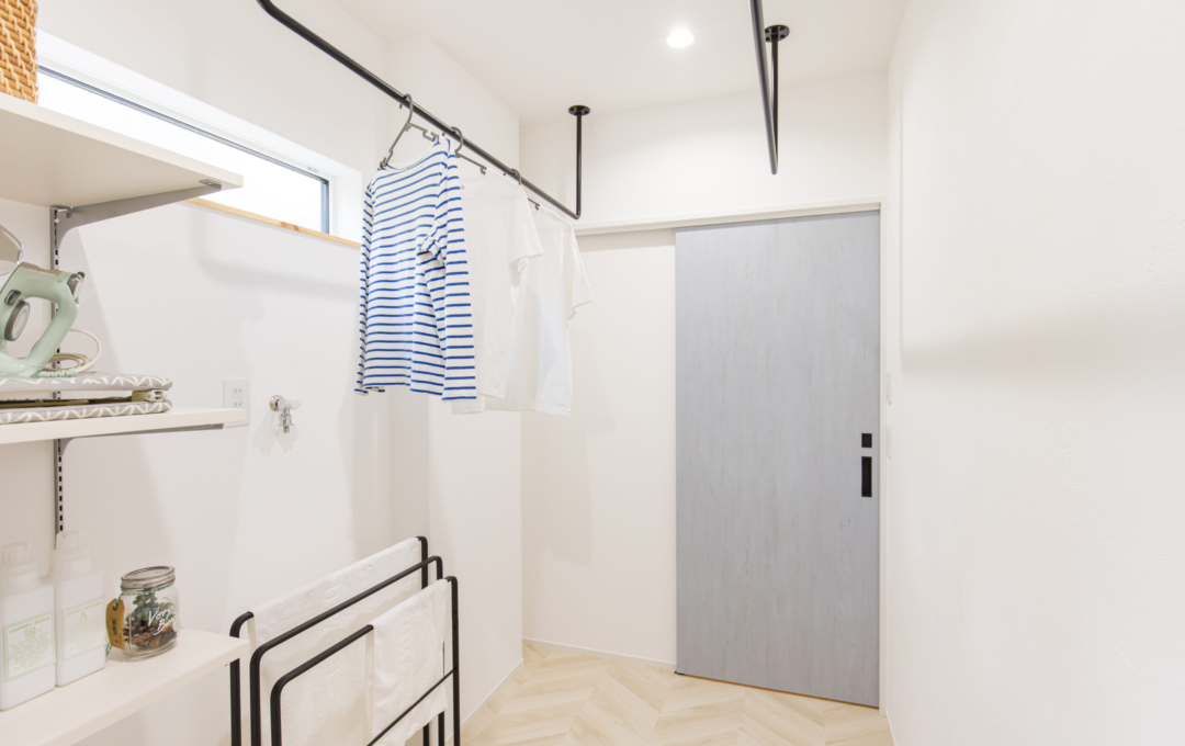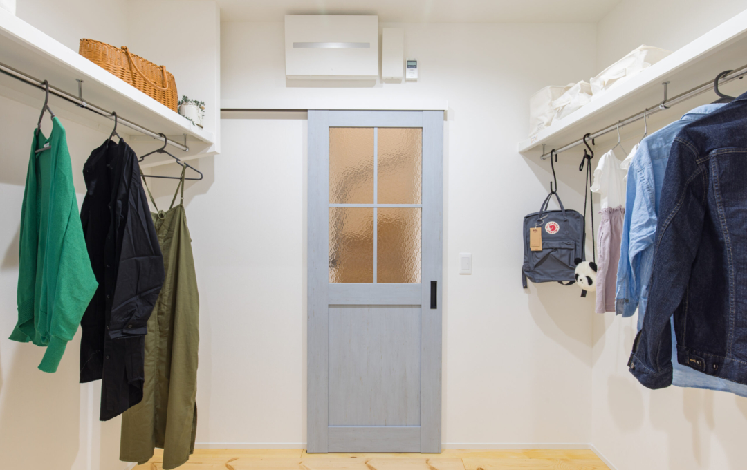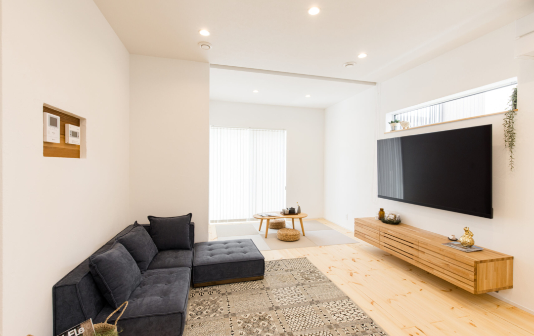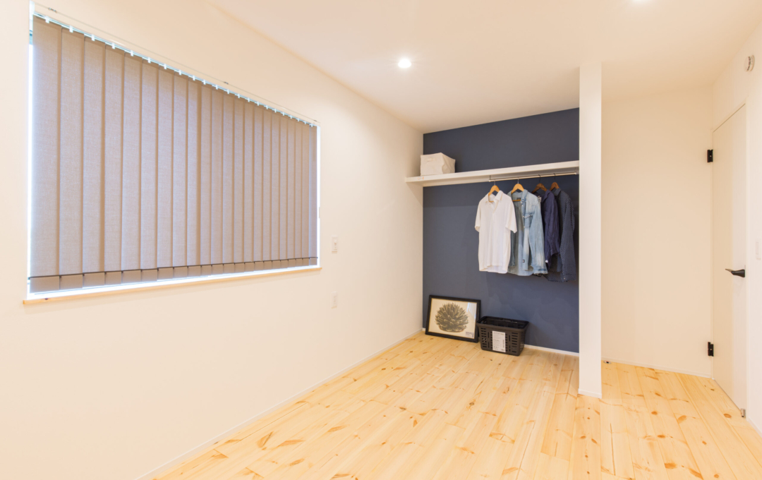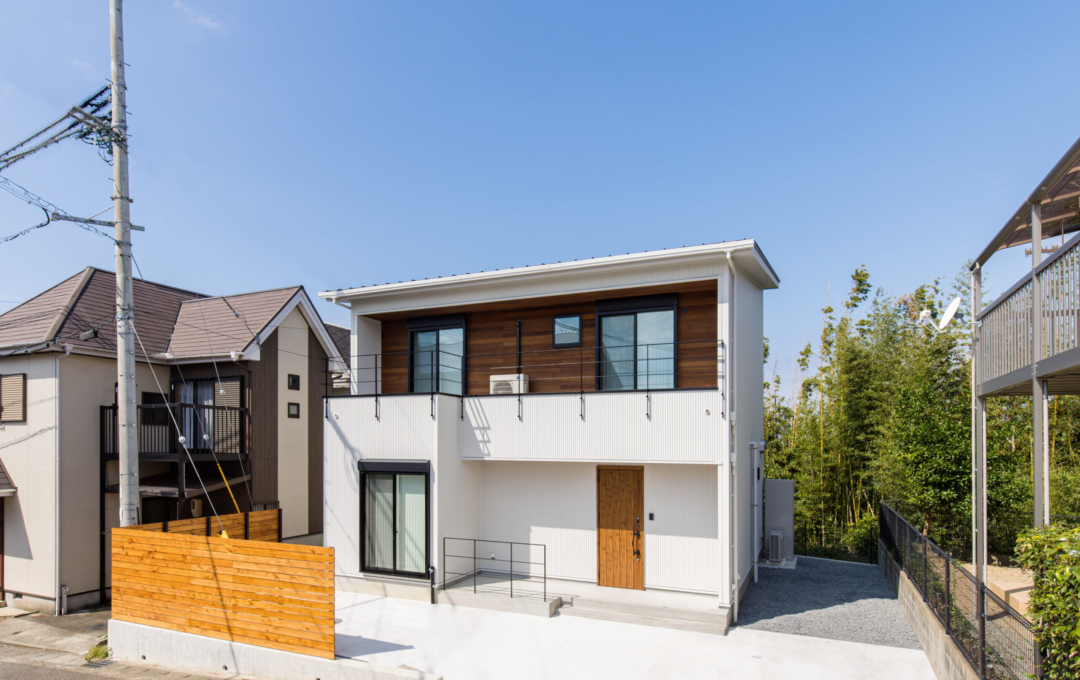 特徴:外観は最後まで悩み、モスグリーンからホワイトに変更。 黒のサッシと、本物のレッドシダーの組み合わせが最高にかっこよく仕上がりました。 道に入った瞬間に見えるおうちなのでとてもカッコいいと評判でした。 内装は北欧好きの奥様と高級感あるキッチンを選んだご主人様との組み合わせでうまくいくようにコーディネートさせていただきました。 床はパイン材のやわらかい雰囲気。 内装は漆喰のをぶんだんに使った壁で調湿効果抜群です。 リビングには畳コーナーもあり、ちょこっと休憩するのにばっちり!! 間仕切りもロールスクリーンで作り、急な来客でもサッと隠せるスグレモノ。 玄関を入ったらすぐに脱衣室とお風呂に繋がる動線。 ファミリークローゼットもおうちの真ん中にあり、それぞれみんなが自分で片づけるように。 二階は子供とご夫婦それぞれの部屋が希望だった奥様。 4部屋プライベート空間も保ちながら寝るまではリビングでみんなで過ごす。 そんなスタイルです。