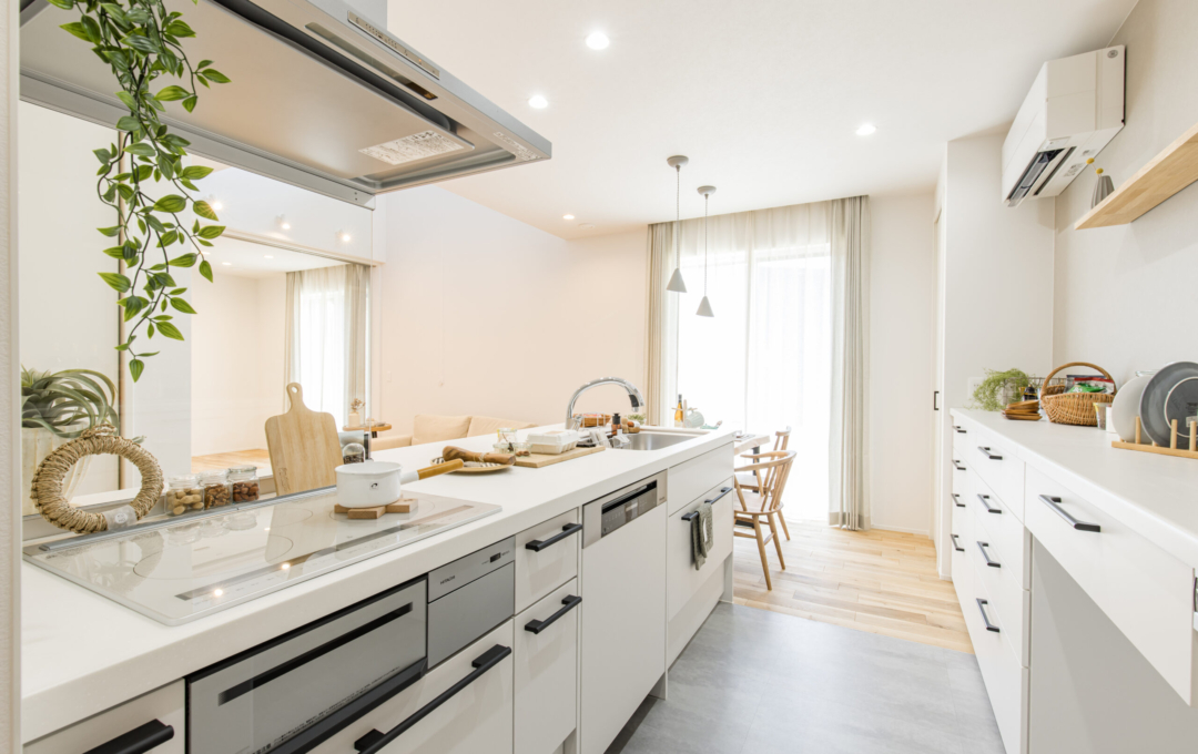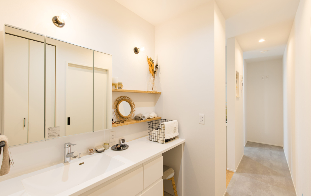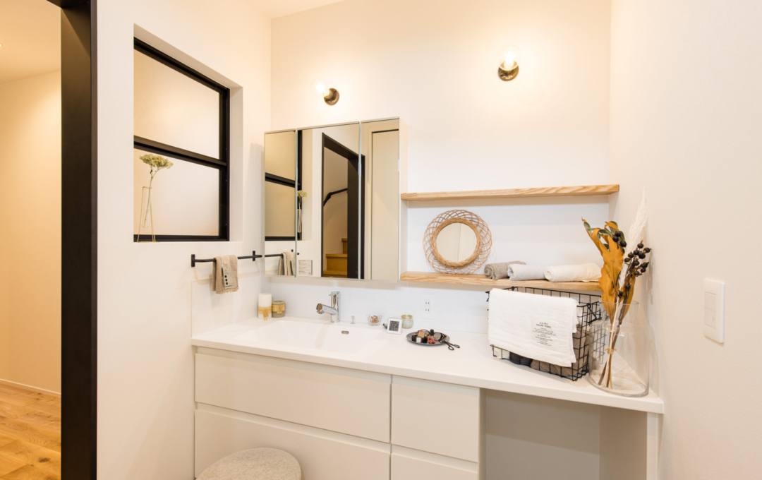 特徴:外観は最後まで悩みダークブラウンのガルバリウム鋼板をメインに南面には漆喰を施工し、明るく白くまぶしいくらいのカッコよさ。 バルコニーをなくし、スッキリした外観です。 洗面にもこだわりました。 アイカのスマートカウンターで、収納も確保しつつ掃除もしやすいメラミンカウンター。 デコマドがポイントです。 動線も最高で洗濯ものを干してすぐに収納できるファミリークローゼットも一階に設置。 玄関は来客時には扉を閉めてスッキリできます。 たくさんのお気に入りを詰めたシンプルだけれど人気のアイテムが沢山。 キッチンの食洗器「ミーレ」はフロントオープンで大容量の収納ができ一日分の食器が一度に洗えます。