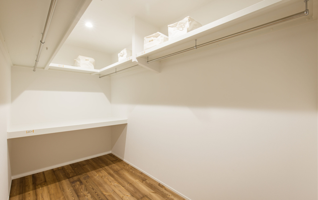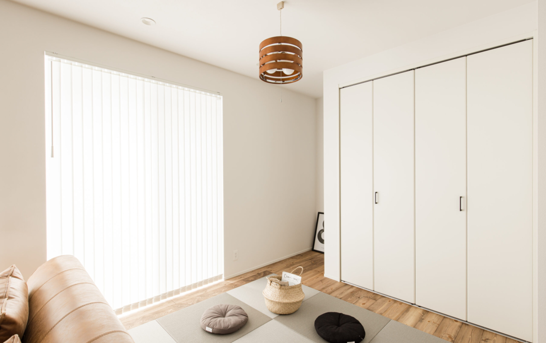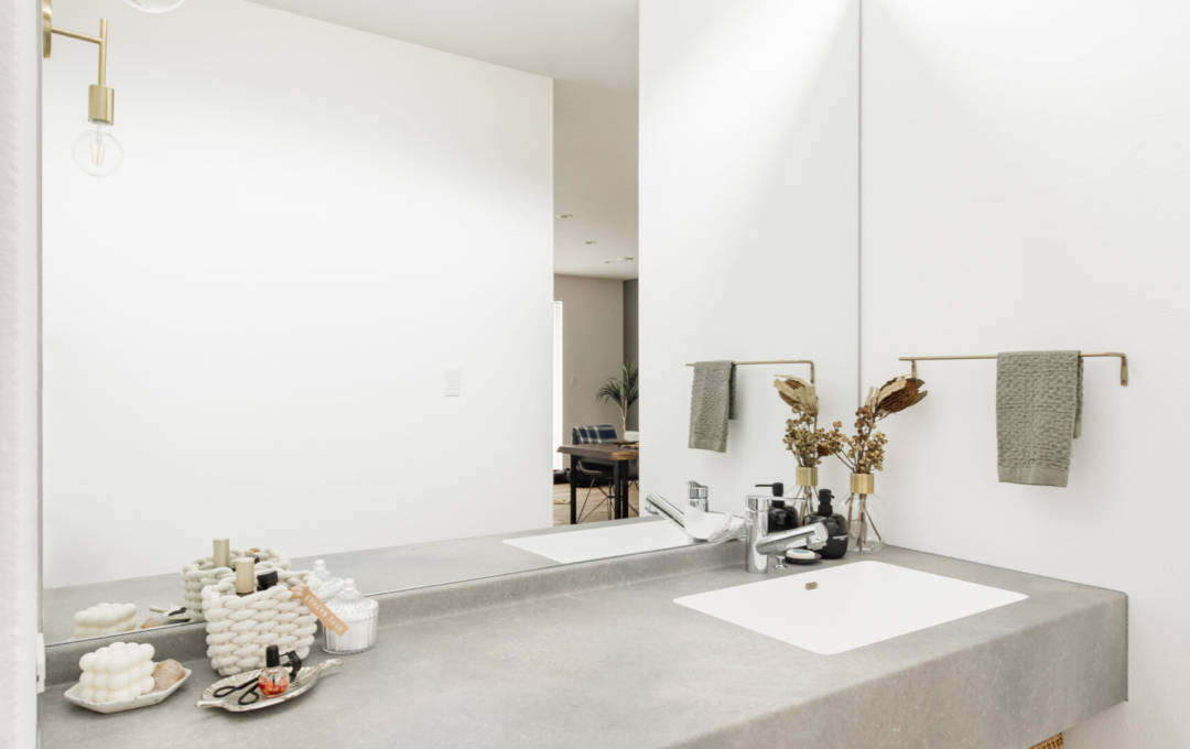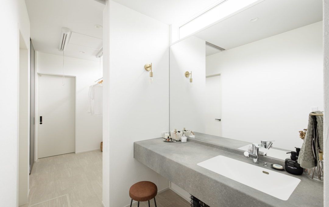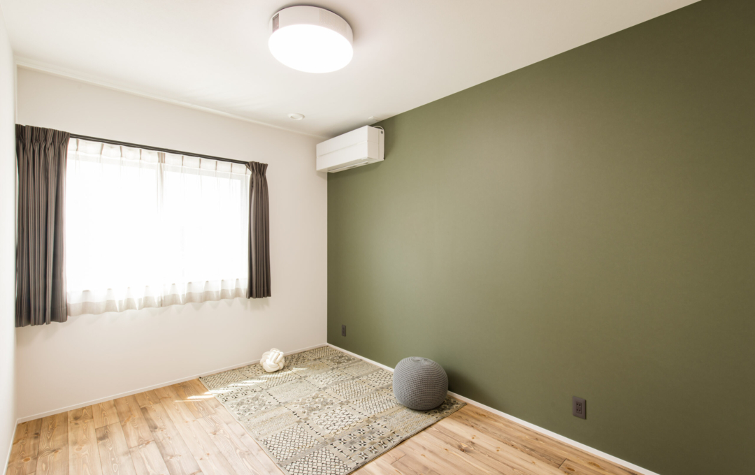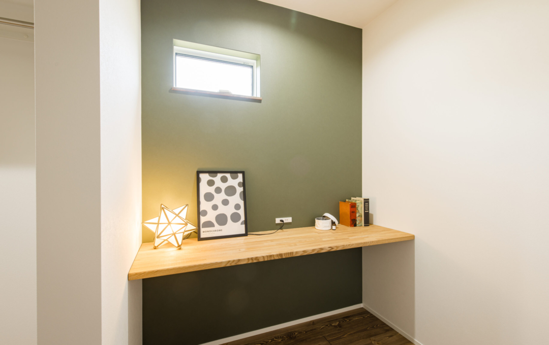 広々したリビングに無垢の床色はウォルナット。全体的にカッコいい仕上がりにしました。グレーの壁紙やダークトーンのトイレ、寝室と二階の書斎にグリーンのお気に入りの壁紙でまとまった空間に。 洗面は鏡を一面に施工し、まるでホテルのような空間に。一日のはじまりが楽しくなります。 リビングには畳スペースがあり、ちょっと一息つく時やお昼寝スペースにも。収納もたっぷり取り、動線も抜群の広々したおうちです。