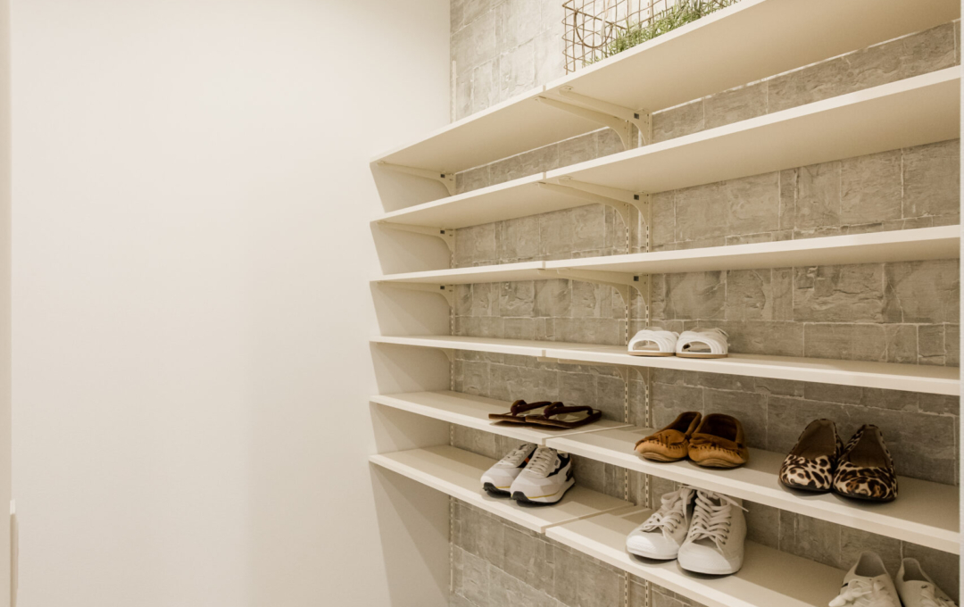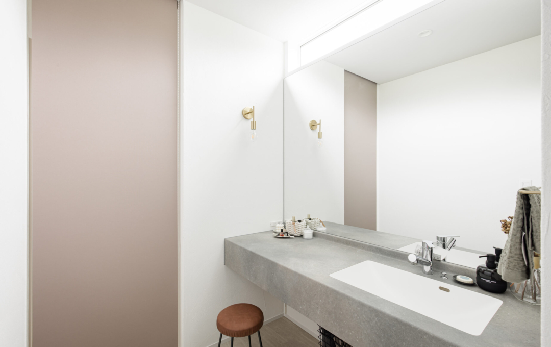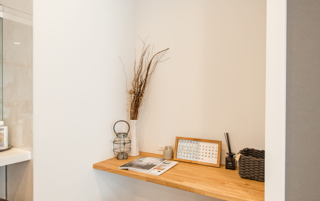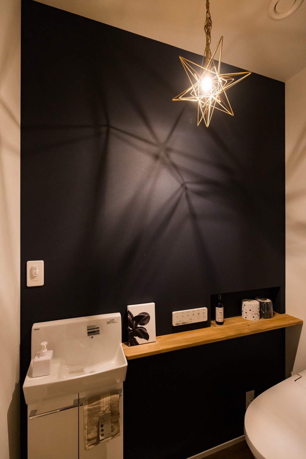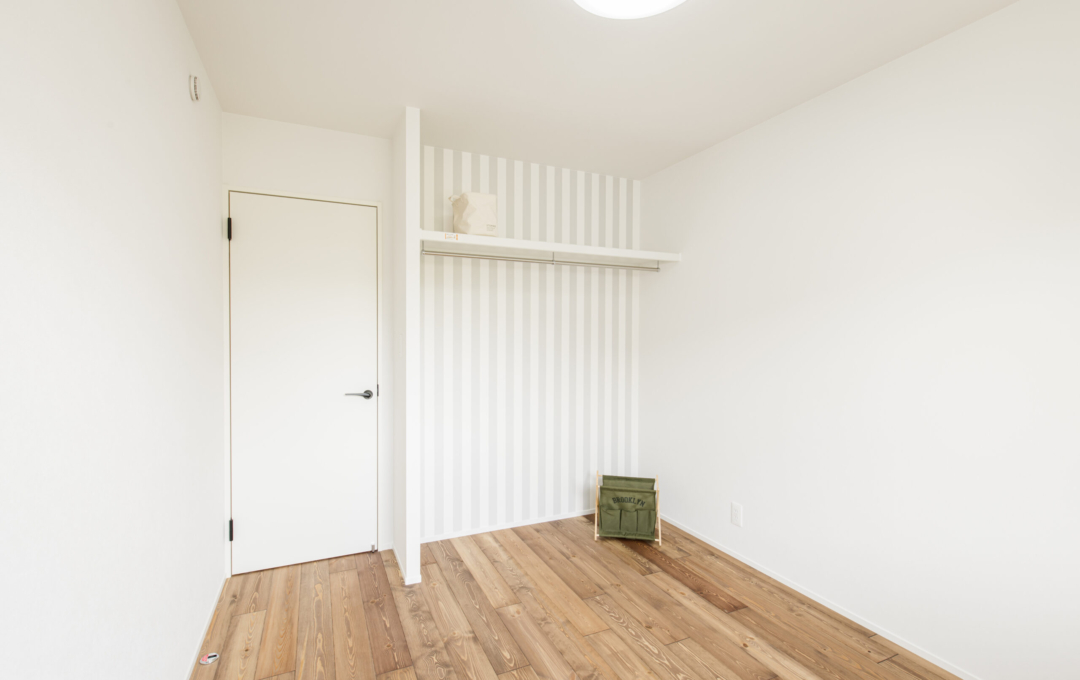 広々したリビングに無垢の床色はウォルナット。全体的にカッコいい仕上がりにしました。グレーの壁紙やダークトーンのトイレ、寝室と二階の書斎にグリーンのお気に入りの壁紙でまとまった空間に。 洗面は鏡を一面に施工し、まるでホテルのような空間に。一日のはじまりが楽しくなります。 リビングには畳スペースがあり、ちょっと一息つく時やお昼寝スペースにも。収納もたっぷり取り、動線も抜群の広々したおうちです。