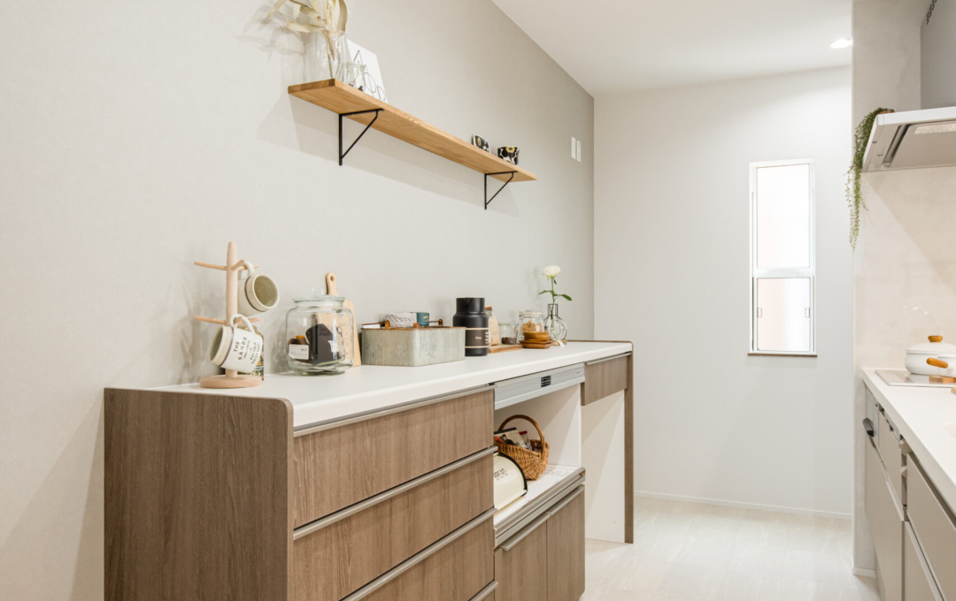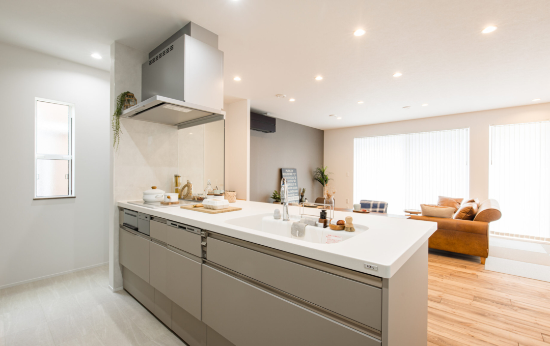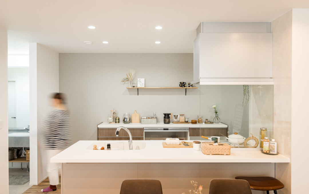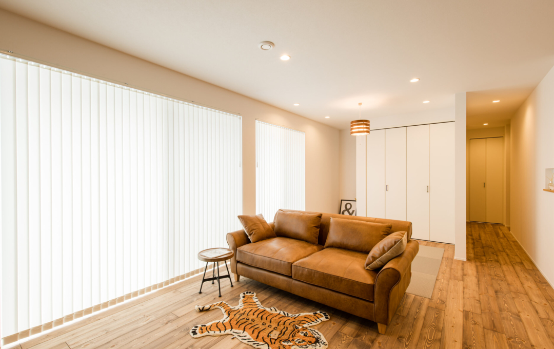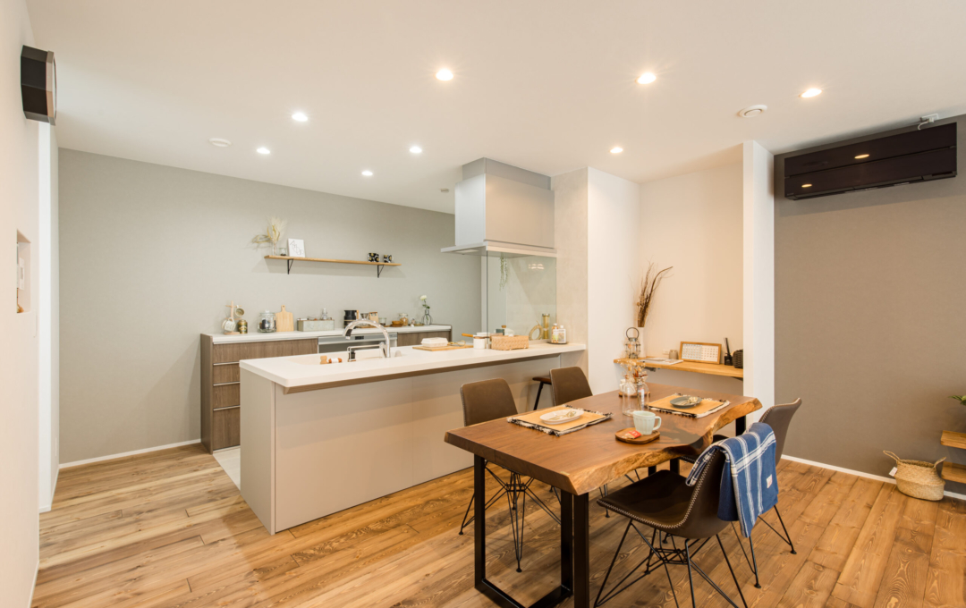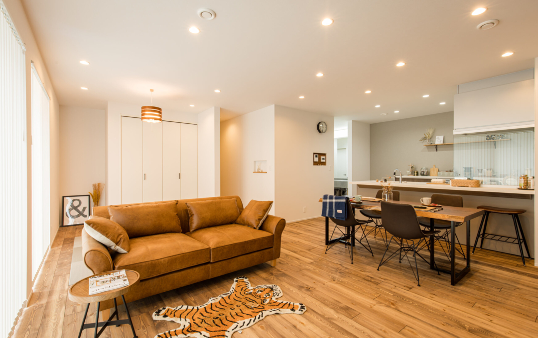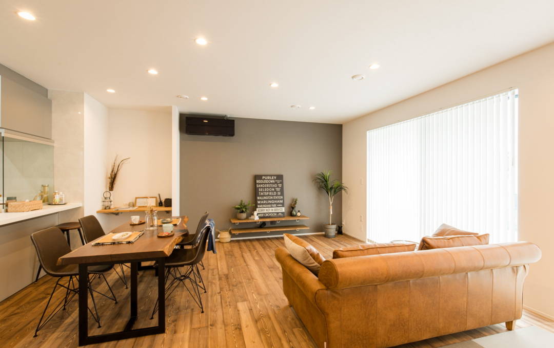 平屋か二階建てか悩みましたが駐車スペースも優先させたくて二階建てになりました。 アンバサダー様のご紹介で見学会に来て下さり、体感を何度かしていただいて決めて下さいました。 キッチンはこだわりの色でまとまった印象に。 床や壁紙もカッコよく仕上がりました。 リビングに畳コーナーがあっても十分に広さを確保。 大きなお気に入りのソファーに1800の一枚板ウォルナットの迫力ある空間になりました。 これを置いてもまだゆとりのあるリビングは友達が来てもゆっくりしてもらえますね。 一階に寝室を。二階には二部屋のみ、二階トイレは不要。などと優先順位をつけ将来の生活を見据えた計画的な間取りになっています。