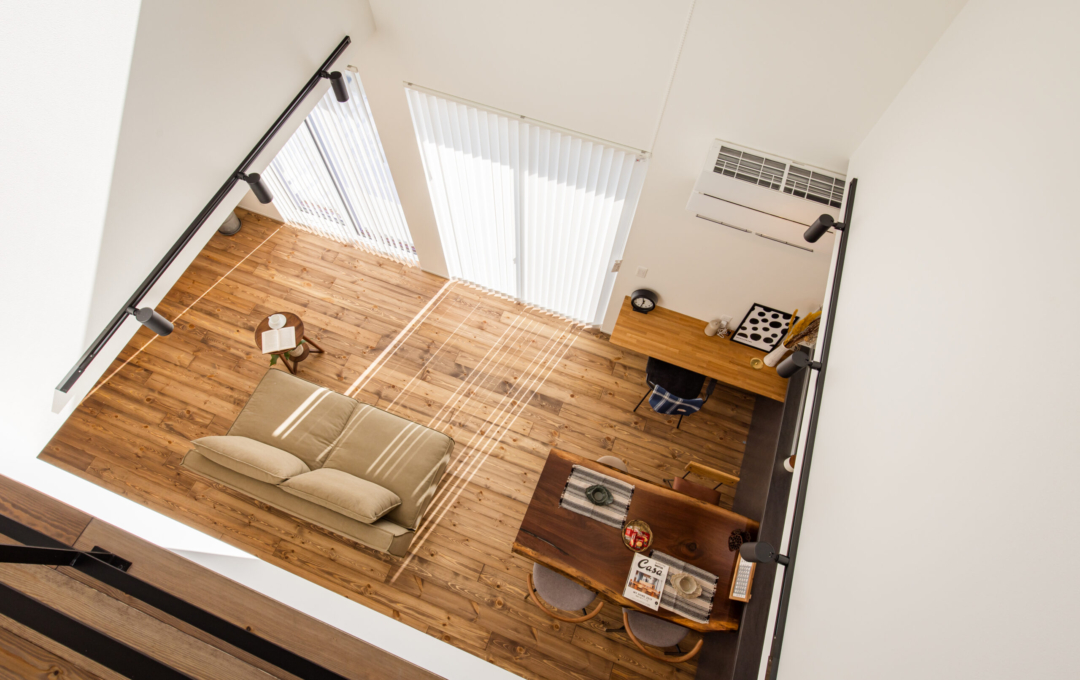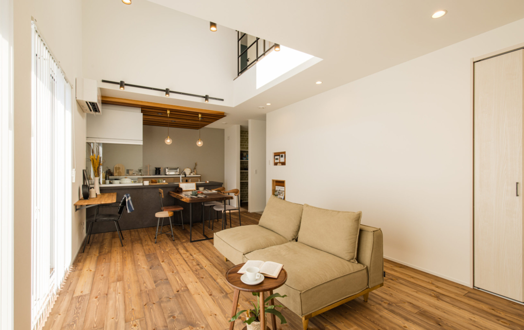 1.2階共に床は標準仕様の無垢のパイン材にウォルナットの自然塗装を施したものを。 カッコいい色合いの落ち着く空間ができました。 ブルーが好きなご夫婦は外壁のガルバリウム鋼板の色もミッドナイトブルーに。 レッドシダーと漆喰の組み合わせは相性バッチリ。