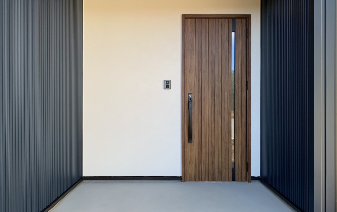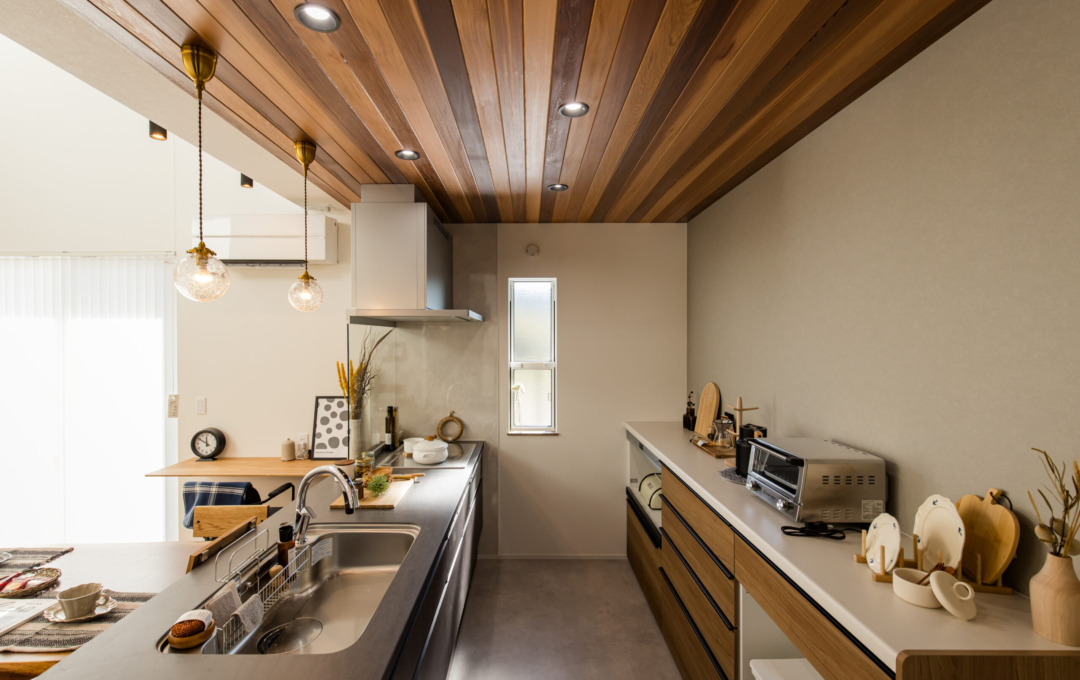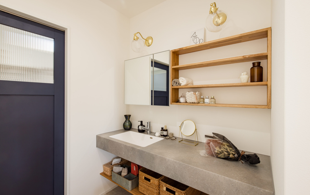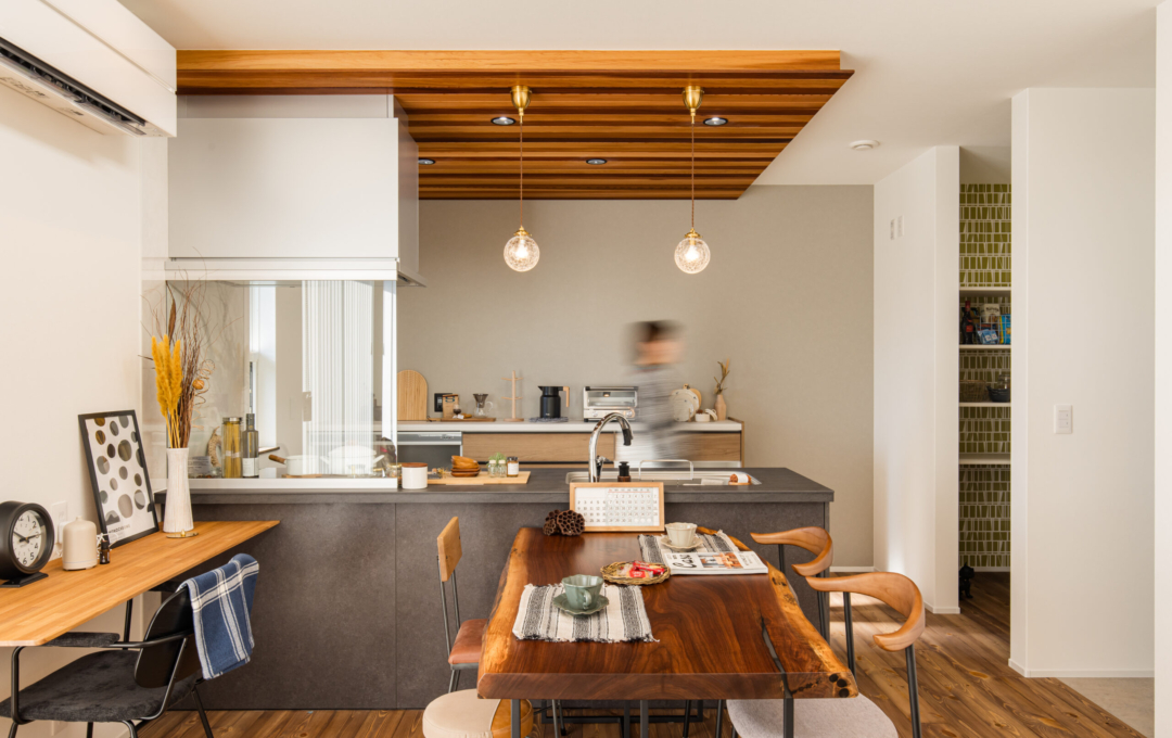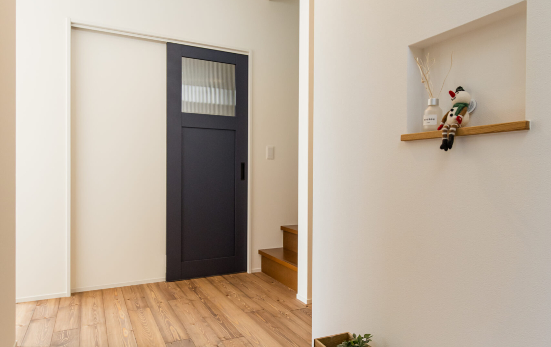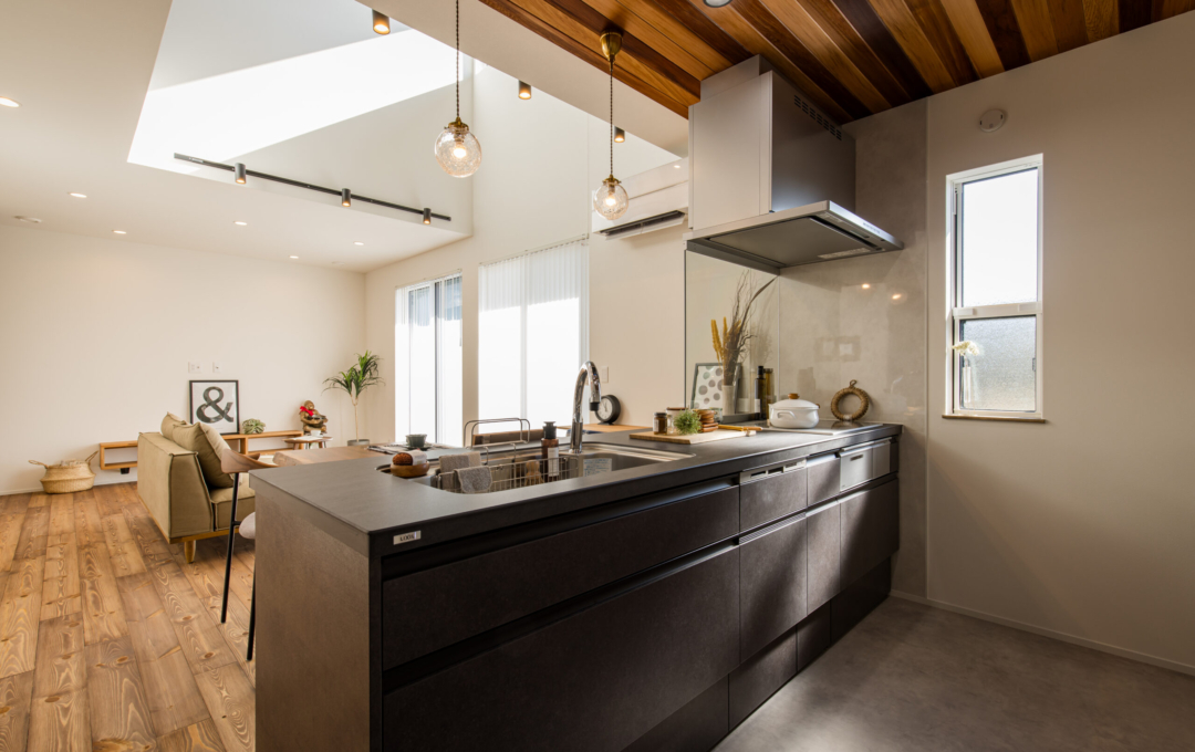 ご兄弟がSHURUSU ieで建築をし、自分たちもおうちが欲しいなと思った時に一緒に完成見学会に来て下さいました。 とっても仲良しのご夫婦は打合せも楽しく、好きなイメージが統一されていたのでウォルナットをベースにネイビーやグレーなどを刺し色にチョイス。 アクセントドアや寝室の壁紙もテンションが上がります。 玄関に入ってすぐの洗面台は完全オーダー(造作)。脱衣室からランドリースペースを広く取り、動線も抜群。 回遊できるので家事もスムーズに。 子供さんが生まれてからも快適に暮らして下さっています。 毎日使うキッチンは下がり天井でリビングから見てもとても良い雰囲気に仕上がりました。 本物のレッドシダーを使っているのでカッコよさがさら際立ちます。 明るく広いリビングは冬でも日中の光が夕方近くまで差し込んでくるパッシブ設計。