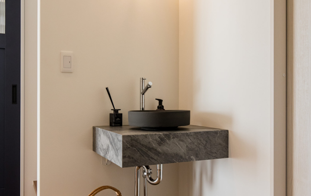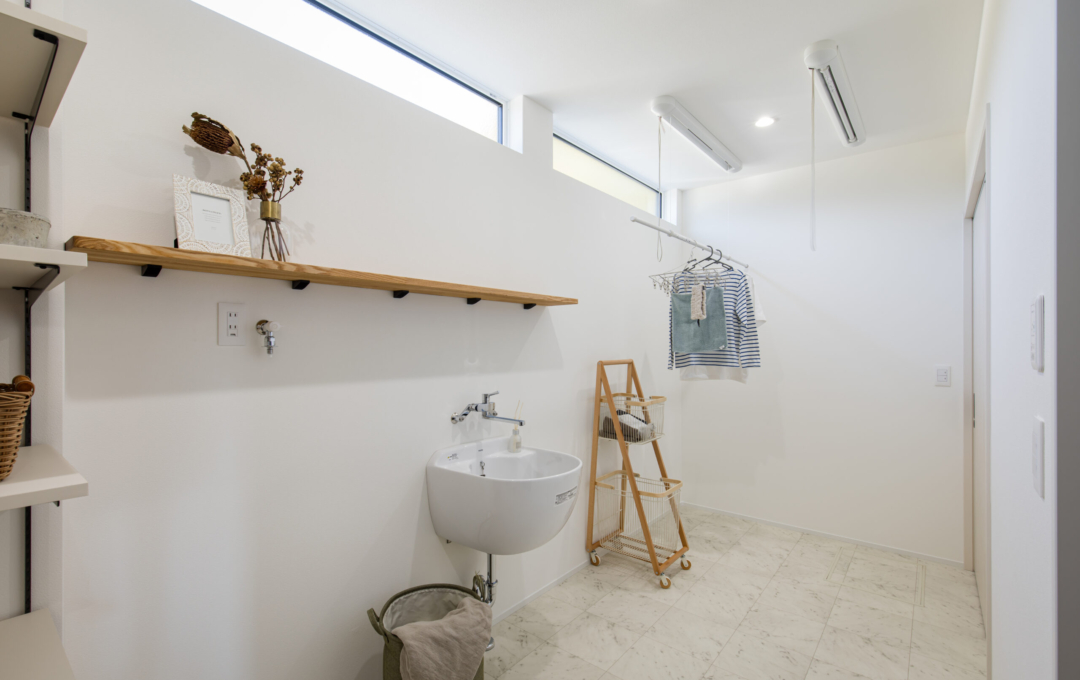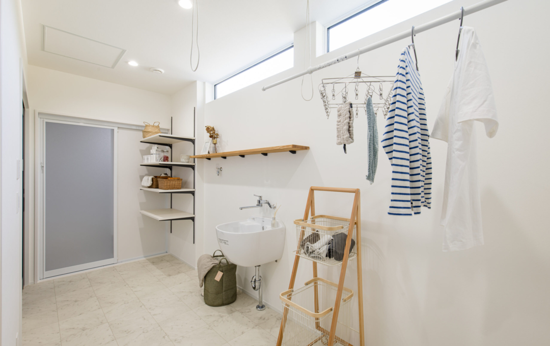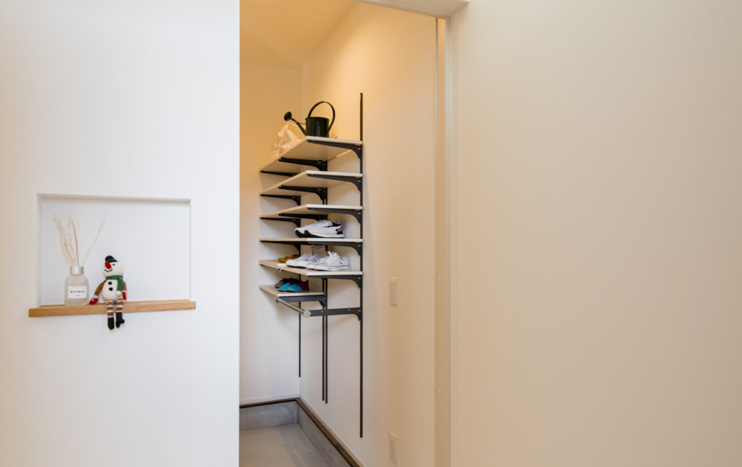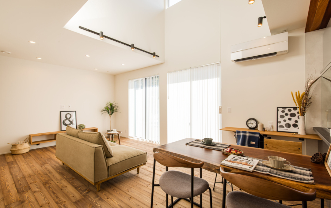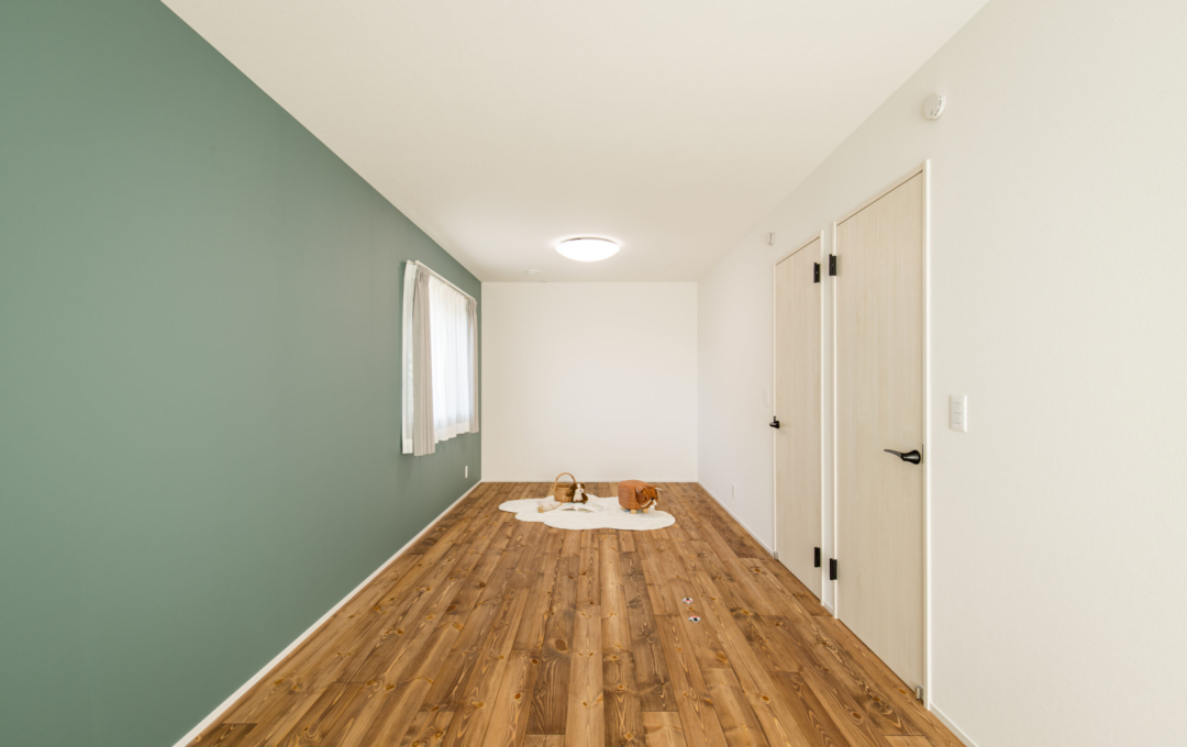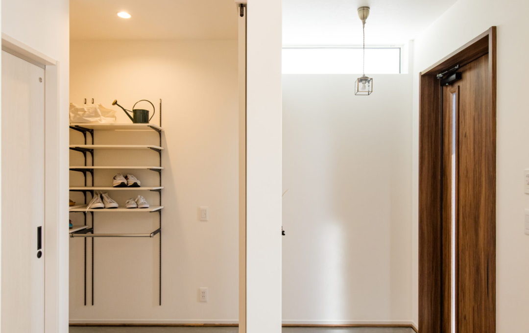 ご兄弟がSHURUSU ieで建築をし、自分たちもおうちが欲しいなと思った時に一緒に完成見学会に来て下さいました。 とっても仲良しのご夫婦は打合せも楽しく、好きなイメージが統一されていたのでウォルナットをベースにネイビーやグレーなどを刺し色にチョイス。 アクセントドアや寝室の壁紙もテンションが上がります。 玄関に入ってすぐの洗面台は完全オーダー(造作)。脱衣室からランドリースペースを広く取り、動線も抜群。 回遊できるので家事もスムーズに。 子供さんが生まれてからも快適に暮らして下さっています。 毎日使うキッチンは下がり天井でリビングから見てもとても良い雰囲気に仕上がりました。 本物のレッドシダーを使っているのでカッコよさがさら際立ちます。 明るく広いリビングは冬でも日中の光が夕方近くまで差し込んでくるパッシブ設計。