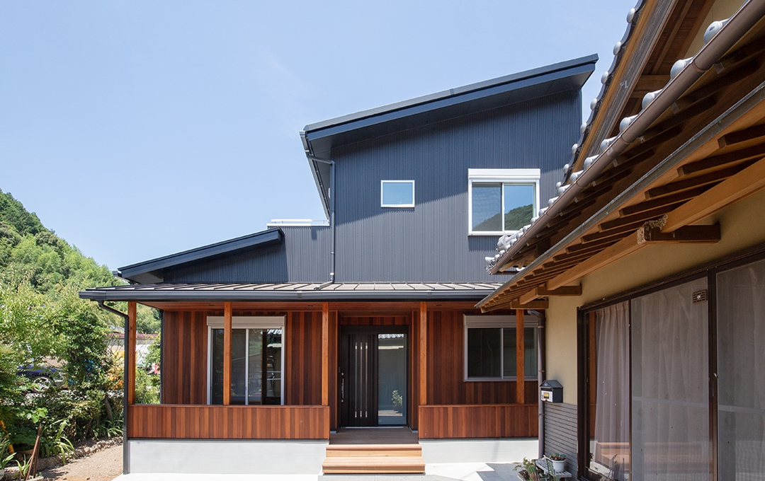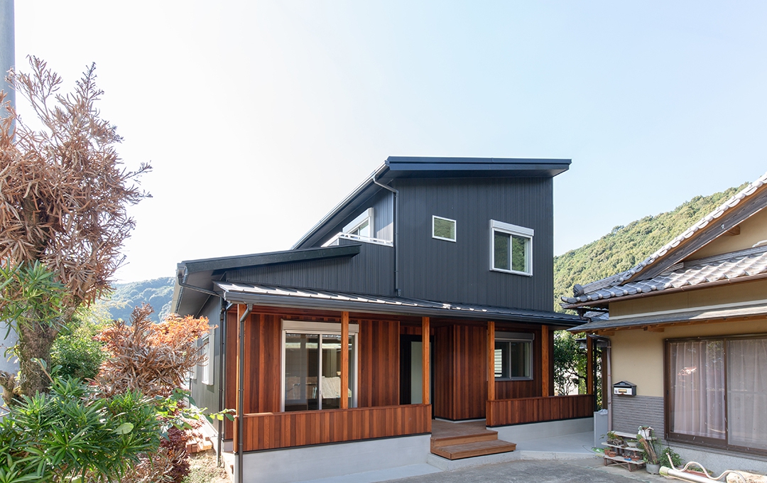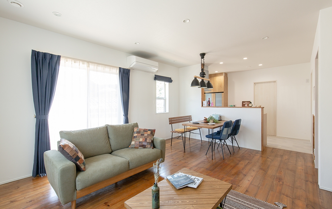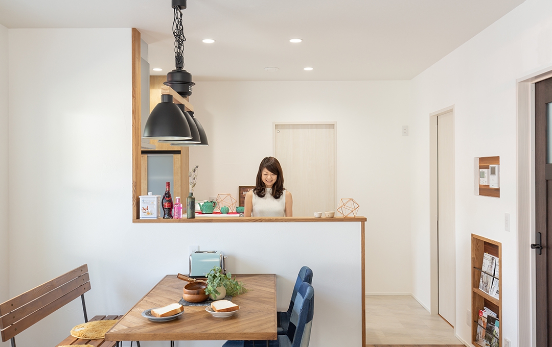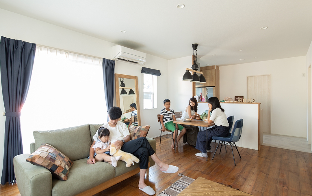 山あいの静かな場所に佇むこの家は、自然と調和するように外構と外壁に木の意匠性を。5人家族がゆったりと過ごすできるリビング空間に、ママお気に入りのキッチンがよく似合います。 今回は、当社コーディネーターからの提案で家具や照明もお気に入りのものを見つけていただきました。落ち着く場所であって欲しいから、たくさんの好きに囲まれた場所に。
