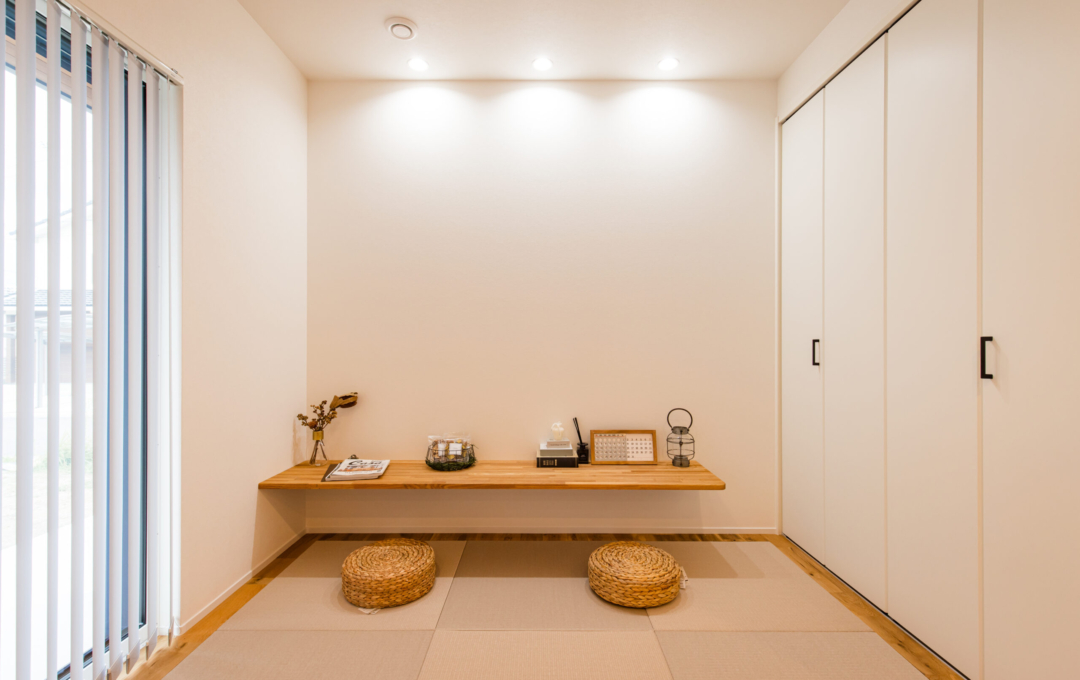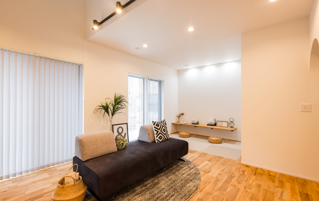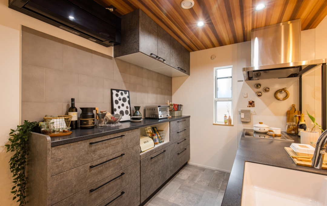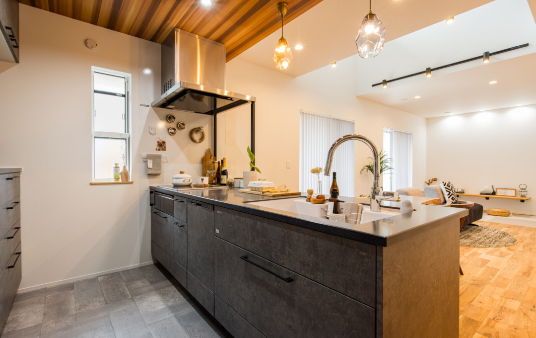 性能にこだわったご主人様が某工務店で聞いてきた情報をもとに事務所に来て下さいました。 何度か完成見学会にご来場いただき、体感してもらって決めて頂きました。 おうちは閑静な住宅街にあり、漆喰とブラックのガルバリウム鋼板がとても存在感のある仕上がりになりました。 内装はカッコいいながらも無垢のナラの床を使用したり、下がり天井が素敵な空間になりました。 リビングには畳コーナーがあり、子供たちが座って勉強するカウンターを取り付けたりちょこっと休憩するのにちょうどいいスペースも できました。 洗面はモザイクタイルにしてガラスのイメージがとても可愛い雰囲気になりました。 階段の途中にはお気に入りのコミックなどを置けるニッチの設置して空間を活用。 キッチンには匂いを取ってくれる【エコカラット】も採用。 お気に入りのパントリーはアーチ壁にして好きなクロスでテンションをUP! キッチンはタカラスタンダードのオフェリアを採用。 お掃除も楽々で毎日の家事が時短に。