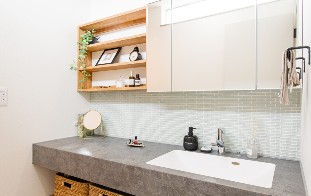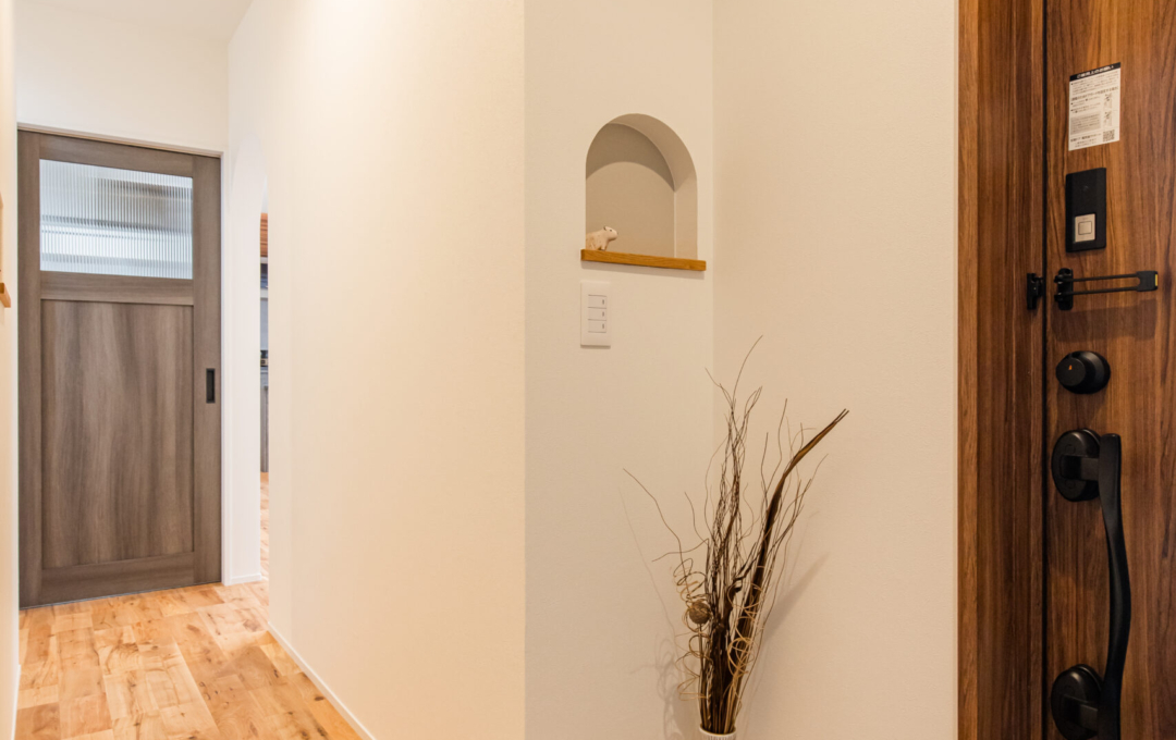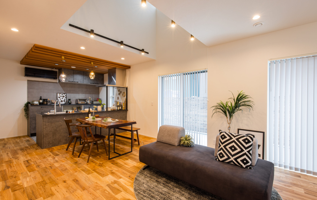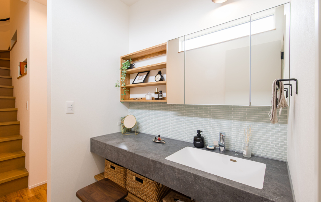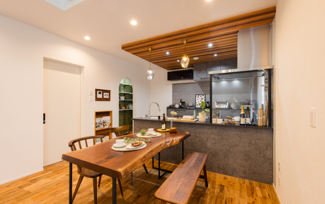 性能にこだわったご主人様が某工務店で聞いてきた情報をもとに事務所に来て下さいました。 何度か完成見学会にご来場いただき、体感してもらって決めて頂きました。 おうちは閑静な住宅街にあり、漆喰とブラックのガルバリウム鋼板がとても存在感のある仕上がりになりました。 内装はカッコいいながらも無垢のナラの床を使用したり、下がり天井が素敵な空間になりました。 リビングには畳コーナーがあり、子供たちが座って勉強するカウンターを取り付けたりちょこっと休憩するのにちょうどいいスペースも できました。 洗面はモザイクタイルにしてガラスのイメージがとても可愛い雰囲気になりました。 階段の途中にはお気に入りのコミックなどを置けるニッチの設置して空間を活用。 キッチンには匂いを取ってくれる【エコカラット】も採用。 お気に入りのパントリーはアーチ壁にして好きなクロスでテンションをUP! キッチンはタカラスタンダードのオフェリアを採用。 お掃除も楽々で毎日の家事が時短に。